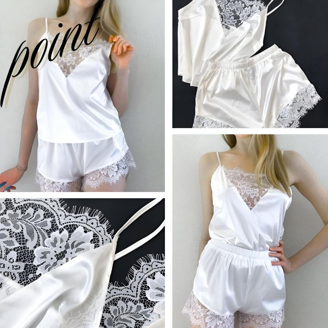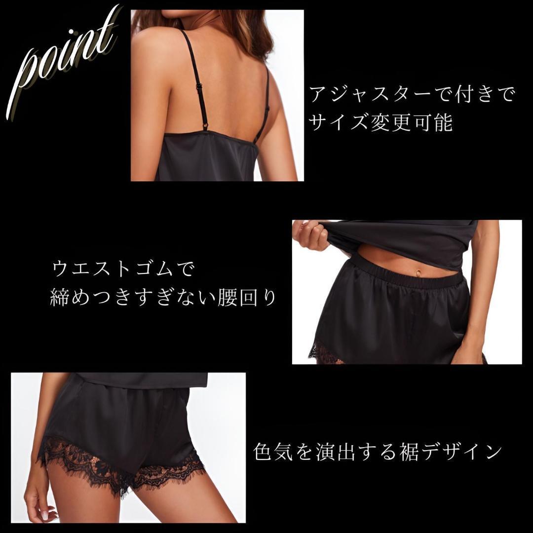 美しい光沢感とレースディテールが魅力的な、キャミソール&ショートパンツの2点セットルームウェア!