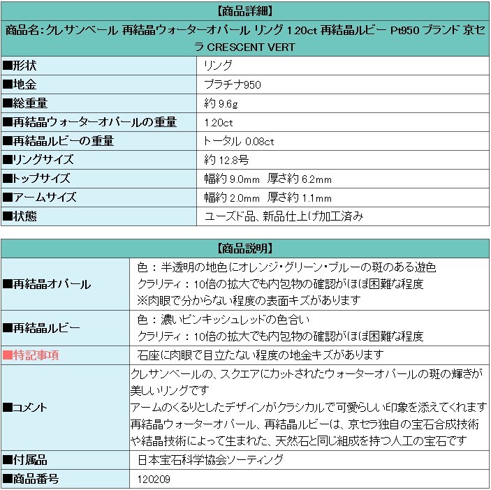 商品名:クレサンベール 再結晶ウォーターオパール リング 1.20ct 再結晶ルビー Pt950 ブランド 京セラ CRESCENT VERT | |