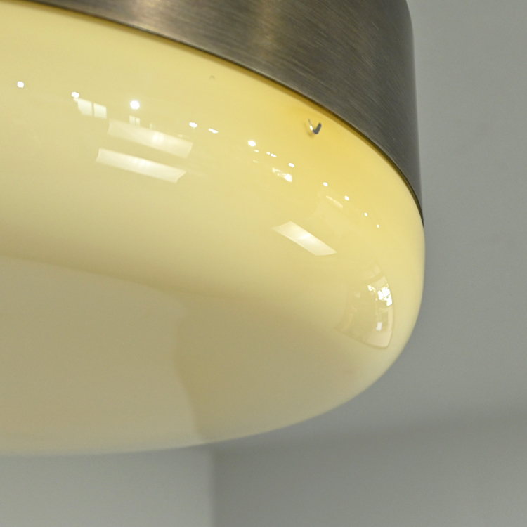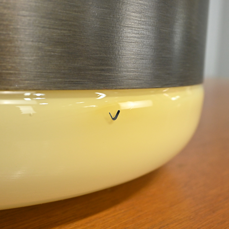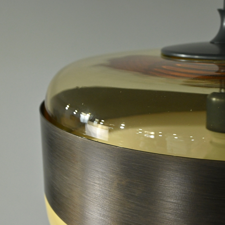 やや平たいフォルムで、上部がアンバー、下部がクリーム色のムラーノ製ガラスの中央に、帯状の金属製パーツを合わせたデザインとなっています。