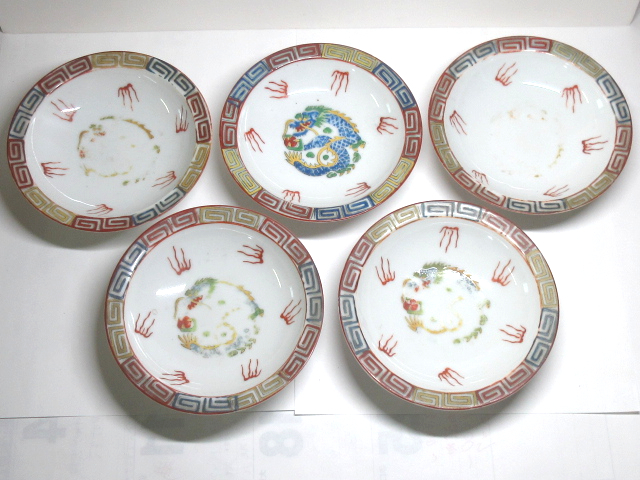 【送料無料】朱雀龍蝙蝠文・色絵小鉢5個揃い★幕末明治・焼き物★骨董・レア・ビンテージ・レトロ・アンティーク・コレクション・美品★