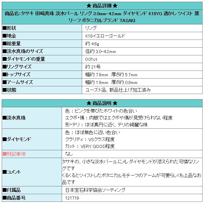 | 商品名:タサキ 田崎真珠 淡水パール リング 3.0mm-4.2mm ダイヤモンド K18YG 透かし ツイスト 葉 リーフ ボタニカルブランド TASAKI | |