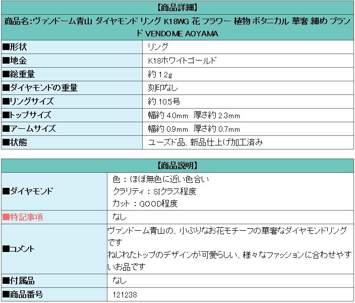 | ■コメント | ヴァンドーム青山の、小ぶりなお花モチーフの華奢なダイヤモンドリングです ねじれたトップのデザインが可愛らしい、様々なファッションに合わせやすいお品です |