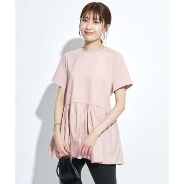 ふわりと広がる異素材使いのぺプラムシルエットが可愛らしいカットソー。ネックには2WAYのスタイリングが楽しめる、取り外し可能なパールをあしらいました。デイリースタイルにはもちろん、デートやオフィスコーデにと、オンオフ問わず幅広く活躍してくれるアイテムです。