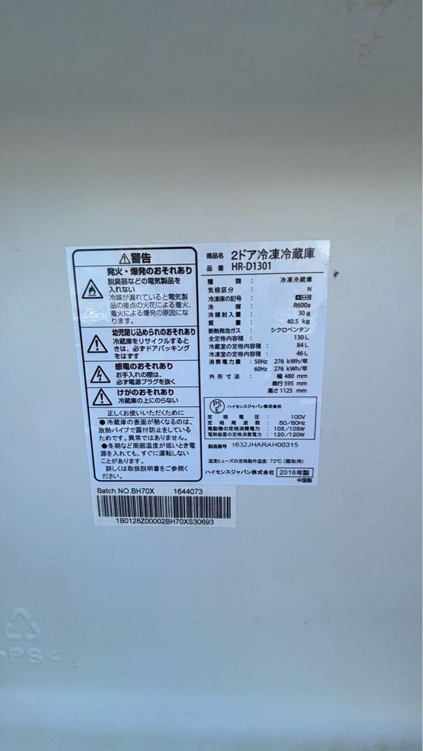 ■HISENSE ハイセンス 冷蔵庫 HR-D1301 130L 2016年製