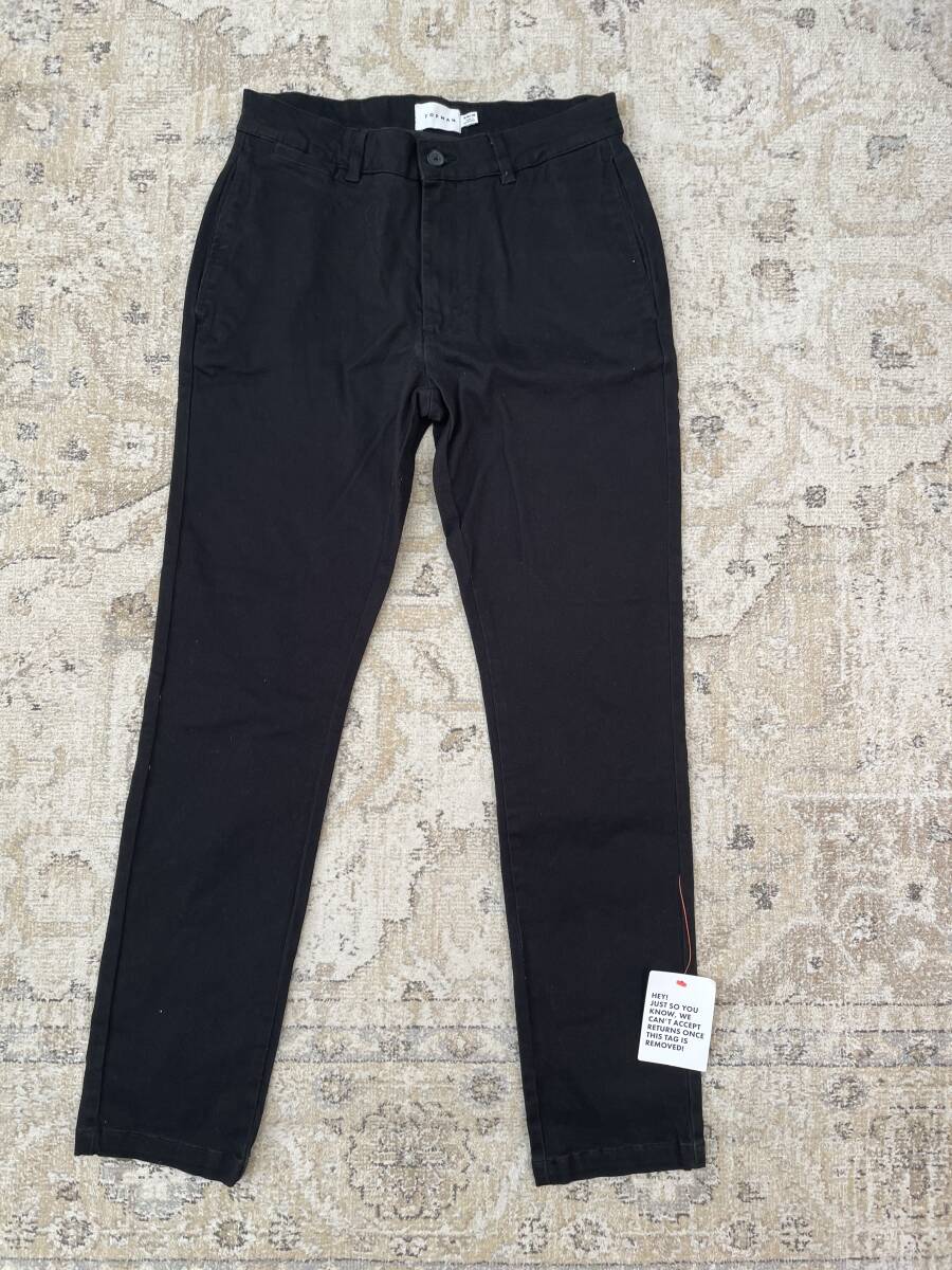 The pants are new and unused with tags. I ordered these pants by accident and I don't need them. It's new. They are a good fit for someone with about a 28-30" waitist. W:30 L:30.  Originally purchased from asos.com