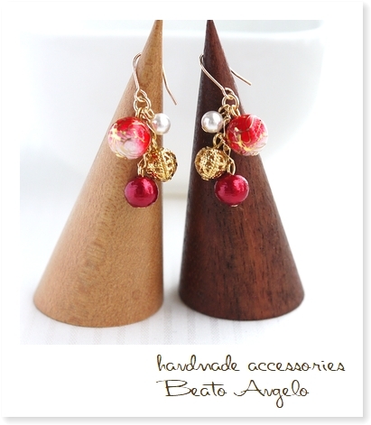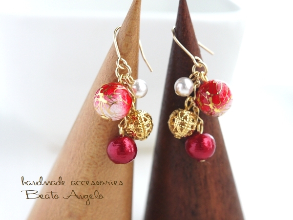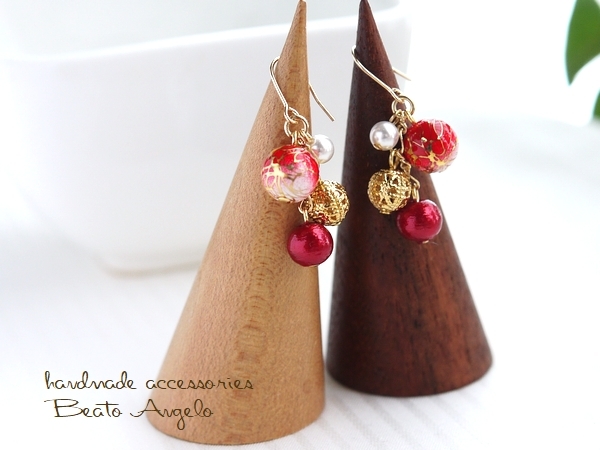 ◇◇+angelo+唐草ビーズとコットンパールのピアス(p-011)赤 G 浴衣 夏 花火 和風 レッド
