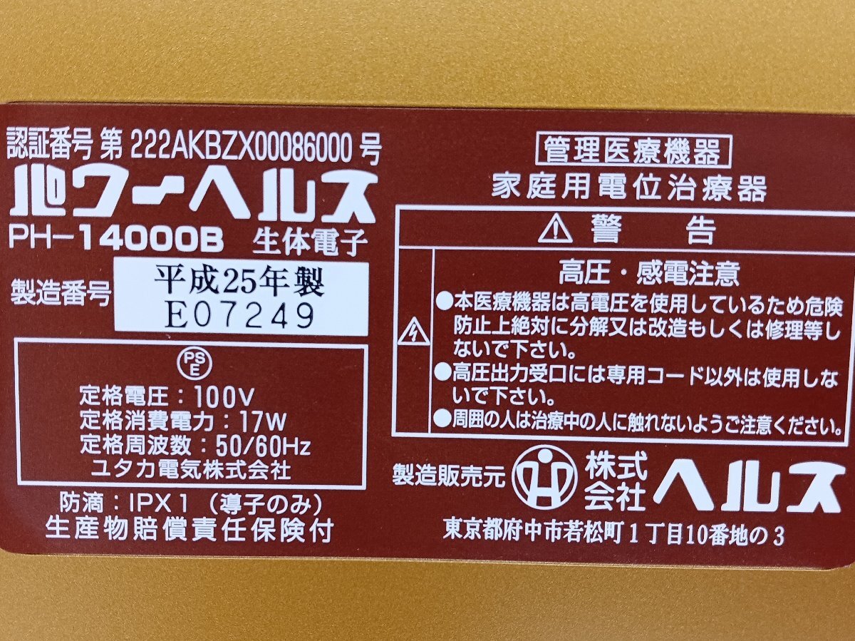 パワーヘルス PH-14000B 家庭用 電位治療器 生体電子 健康器具 中古 動作確認済み 通電マット 絶縁マット付 平成25年製 2013年製