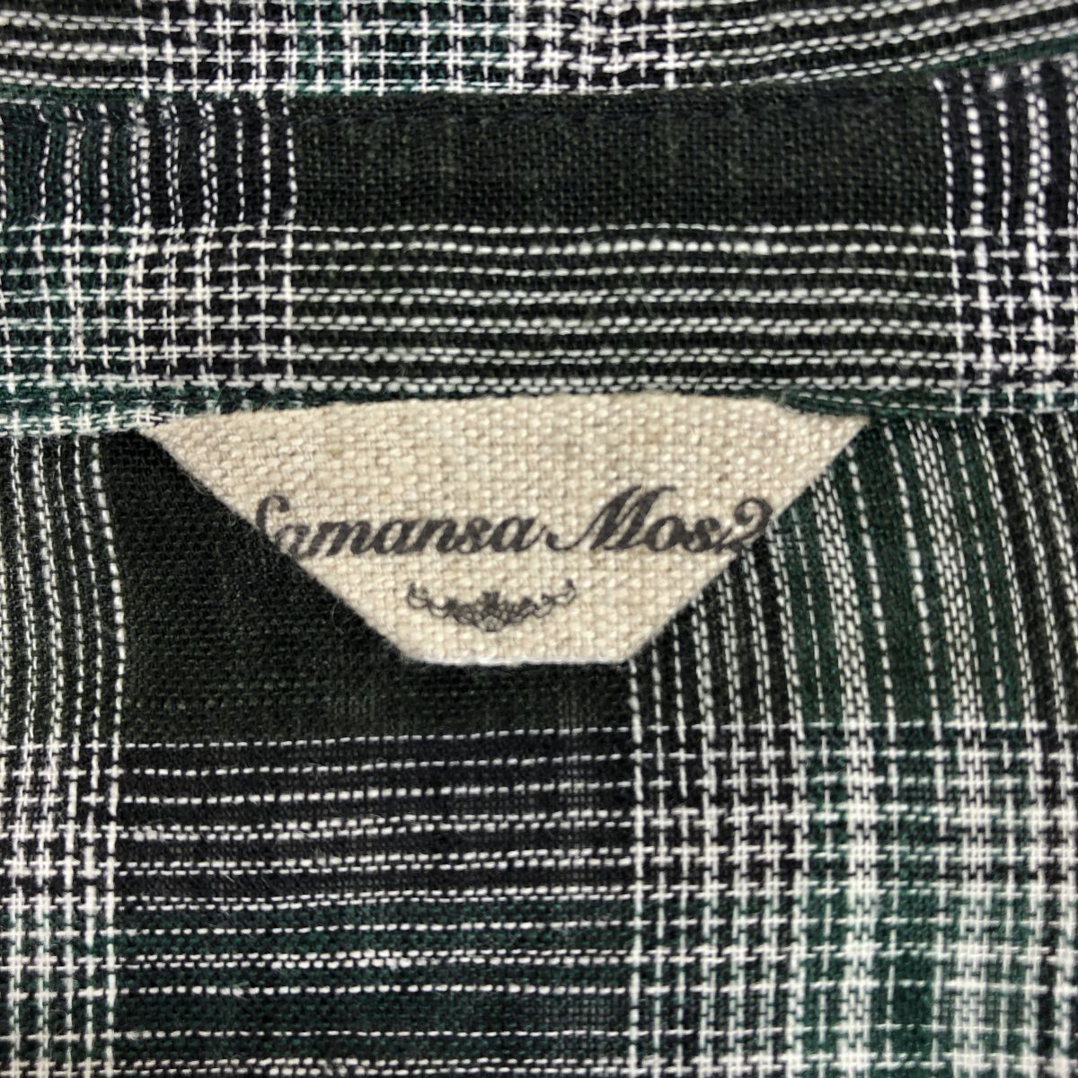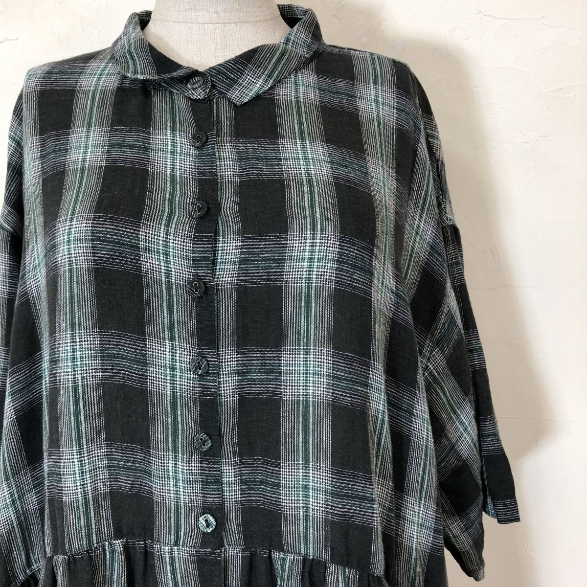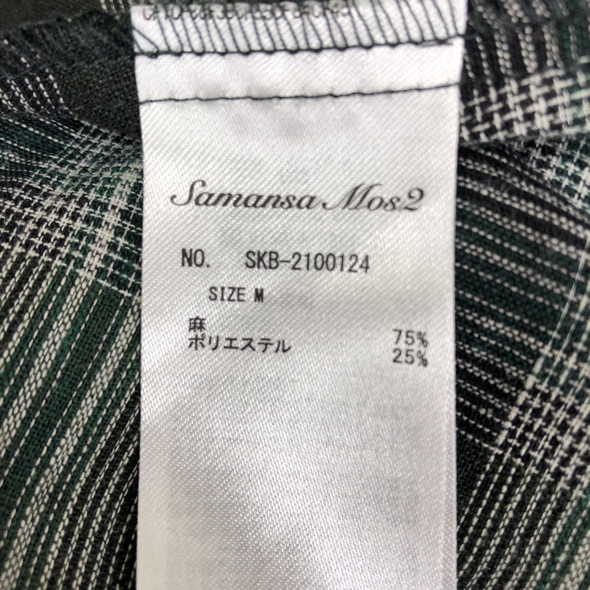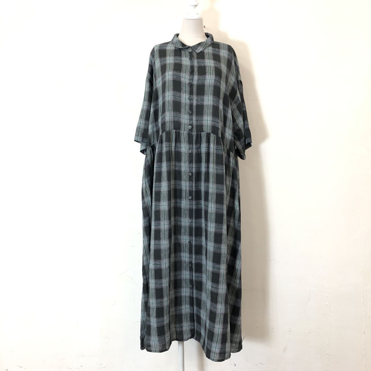 2S3278-Y-N◆SamansaMos2 サマンサモスモス 半袖シャツワンピース ロング丈 チェック 布ボタン リネンブレンド ◆sizeM ブラック 麻 ポリ
