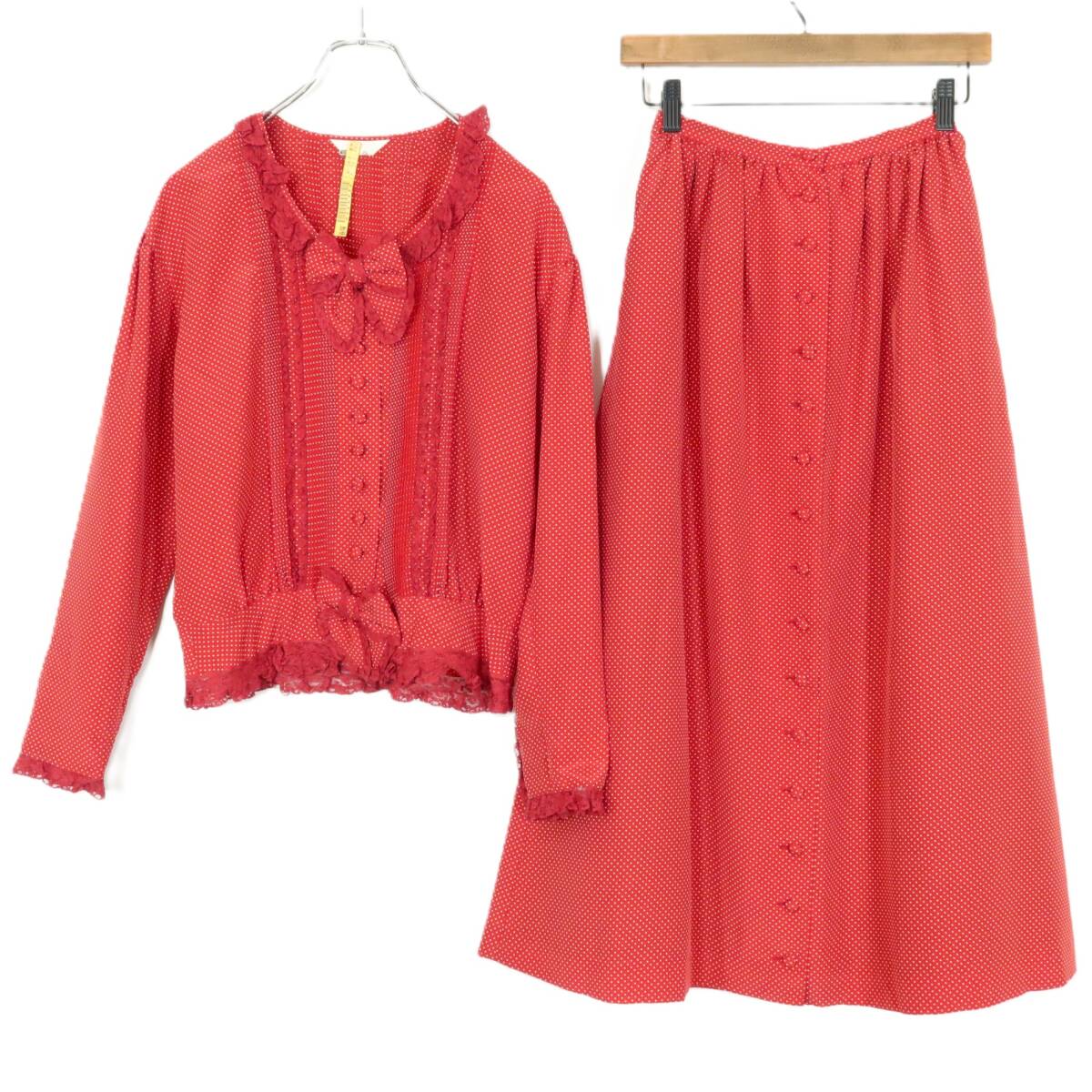 商品説明 | 【実寸約】肩幅48袖丈54バスト100着丈53(cm) ウエスト63丈81(cm) 【サイズ表記】 なし。実寸をご参照くださいませ。 【素材】ポリエステル100% 【状態】使用感少なめの美品 【デザイン】赤系 長袖ブラウス&ロング丈フレアスカートのセットアップです。 ピンタックやレースのフリル、共布リボンなど、ピンクハウスらしい飾りが満載♪ スカートにはウエストにリボンベルト付き。 上下ともくるみボタンのフロントオープンデザインです。 薄手/ドット柄 スカートは裏地とポケットあり セットでも単品でもロマンティックコーデに大活躍するアイテムです。 |