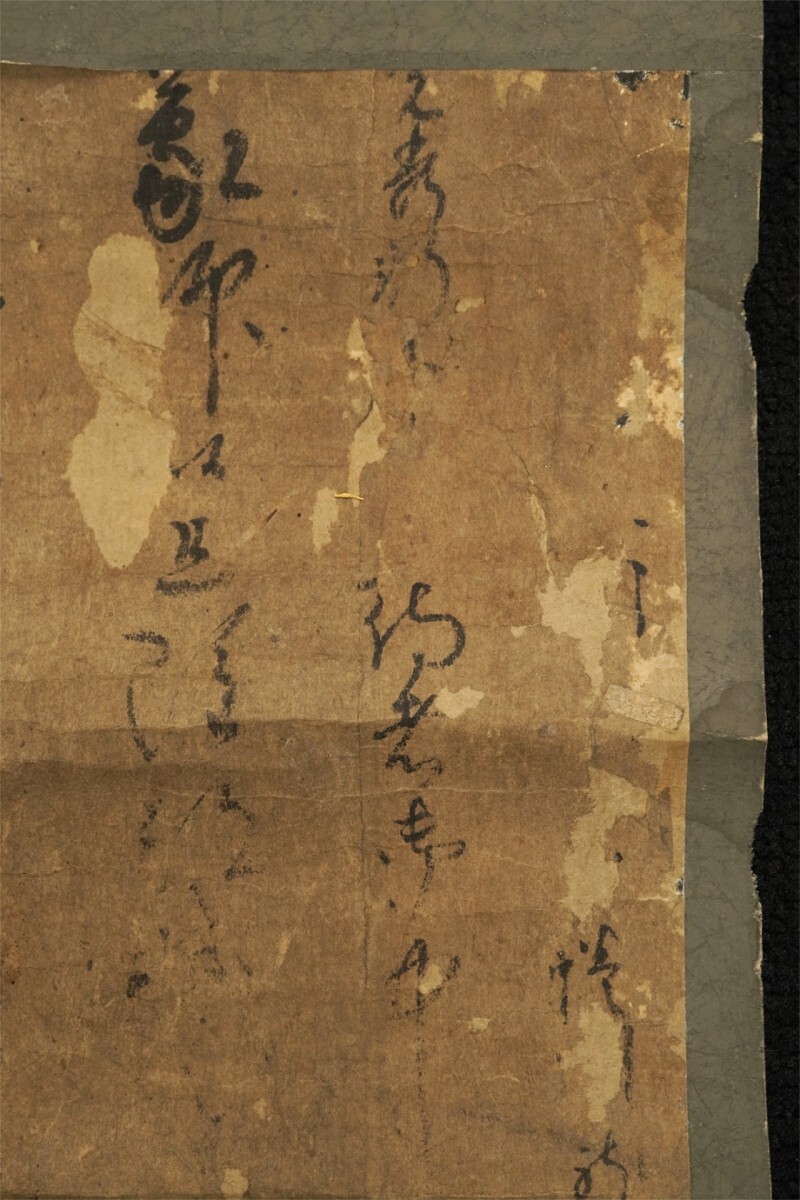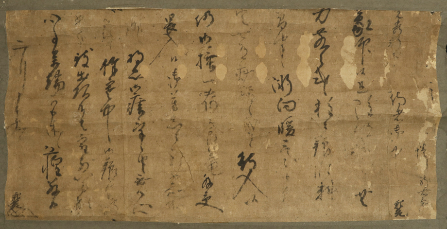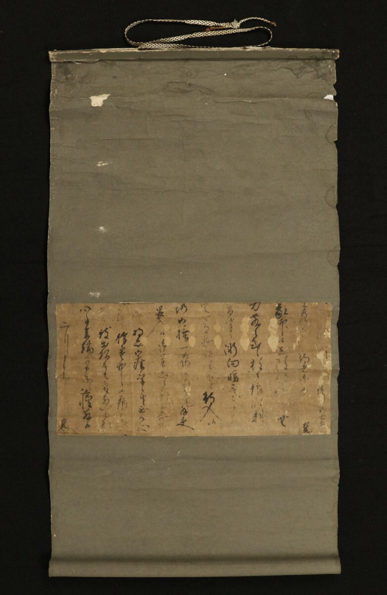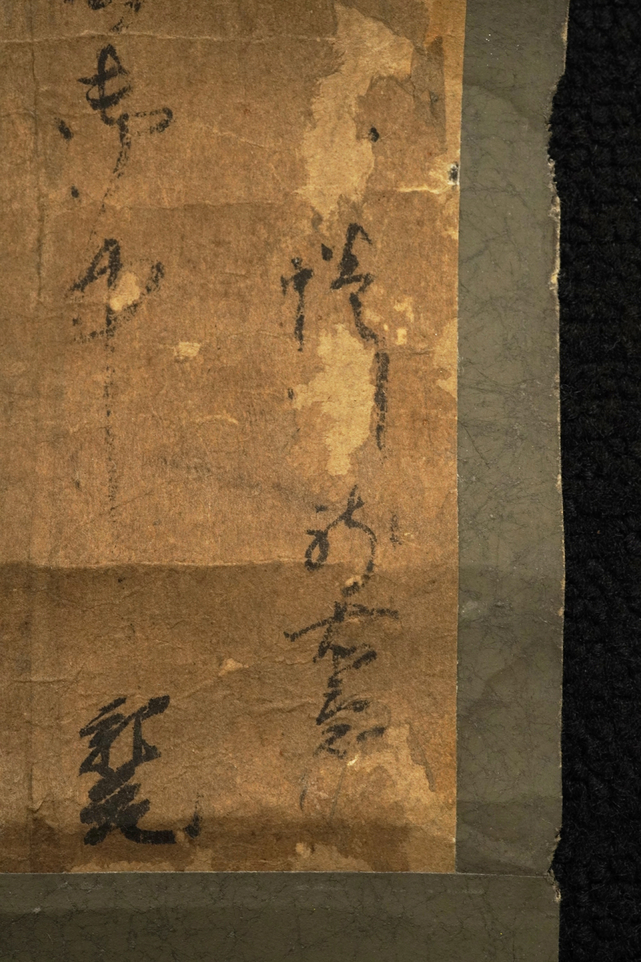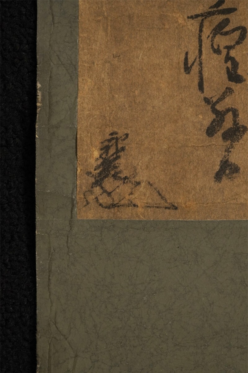 総丈サイズ…横 47 × 縦 87 cm 紙本 状態…オレ・傷ミ 本紙ヤケ 軸先無 巻緒・掛緒傷ミ 「(端裏) 蜷川新右衛門 覚秀軒参 侍者御中 親元 蒙仰候 且雖跡□□□無 力散々式候 種々養性料 簡半候 漸向暖気申節 定可有炉談候哉と待入候 仍御一種一荷食篭殊更 畏入候 御芳志之義不知所 謝候 将亦御咳気之由候 無御心 許候 餘寒中御養生専 □□候 致出頭候者最前以拝顔 心事万端可申述候 恐惶敬白 二月十一日 親元(花押)」 【印刷ではありません】 【真作】 蜷川新右衛門 室町時代中期の幕府吏僚、連歌師。俗名は蜷川親当、通称新右衛門。法名は五峰とされ、雅名は智蘊。室町幕府の政所代を世襲する蜷川氏の出身。蜷川親俊の次子。兄に貞繁、姉妹に伊勢貞国室、子に親元、岩松明純室がいる。一休宗純との親交によって広く知られている。 |