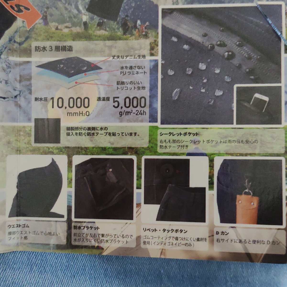 丈夫なデニム生地+水を通さないPUラミネート+肌触りのいいトリコット生地の3層構造。驚くほど水を防ぐ、防水デニムパンツです。前立てが左右でつながっているので、水が入りにくい防水ブラケット。縫製部分の裏側には、水の侵入を防ぐ防水テープを貼っています。