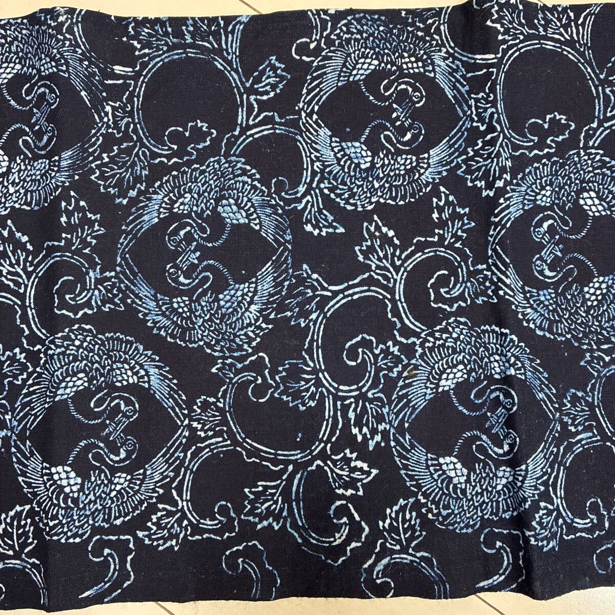 【藍染 向かい鶴に唐草 両面柄 型染めはぎれ】