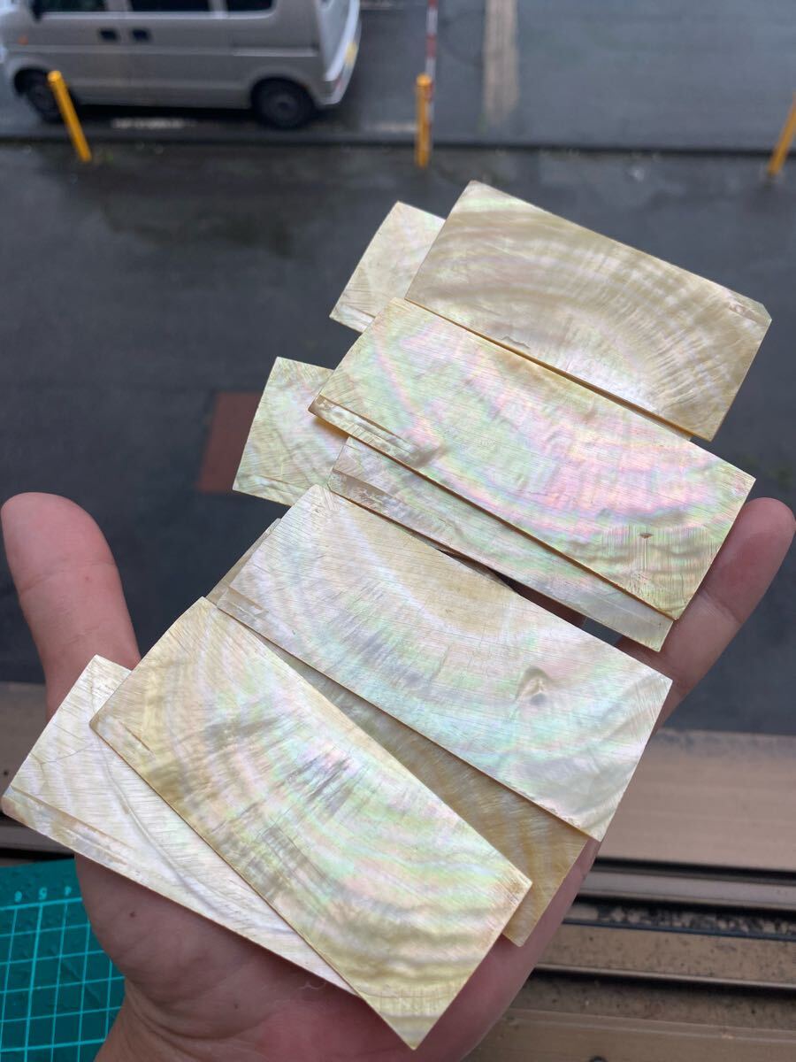 * 活かし貝殻を小さなパーツに切り分け、磨いて平らに仕上げてます
