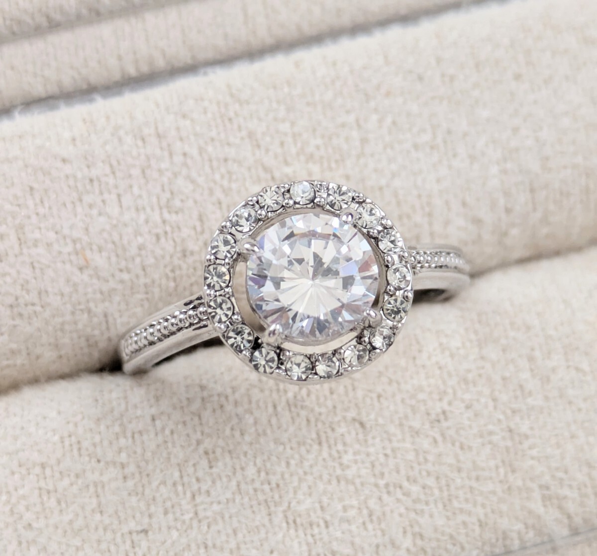 ラウンドカットのストーンを中心にしたシルバーリング、人工ダイヤモンドの装飾が魅力的。