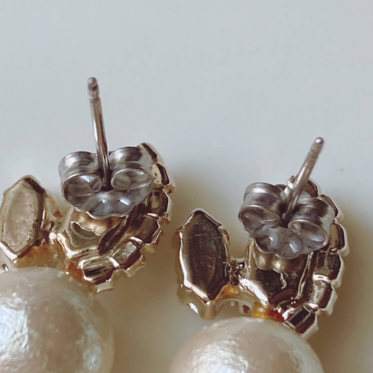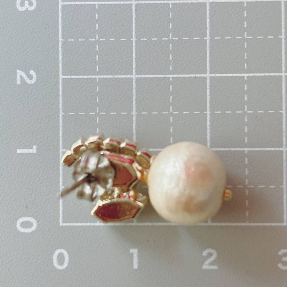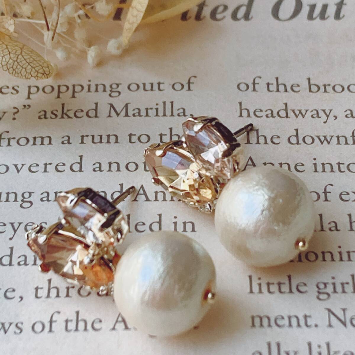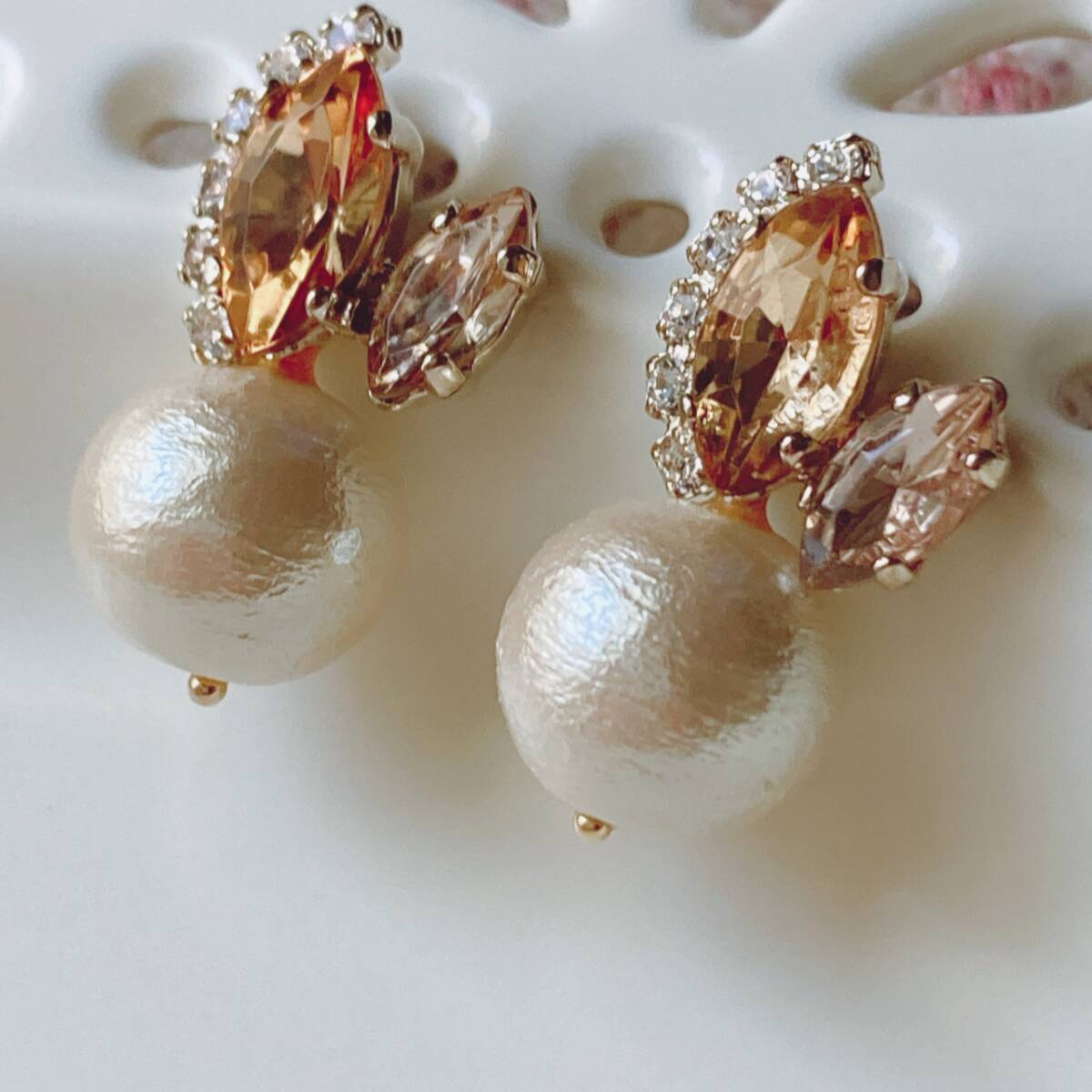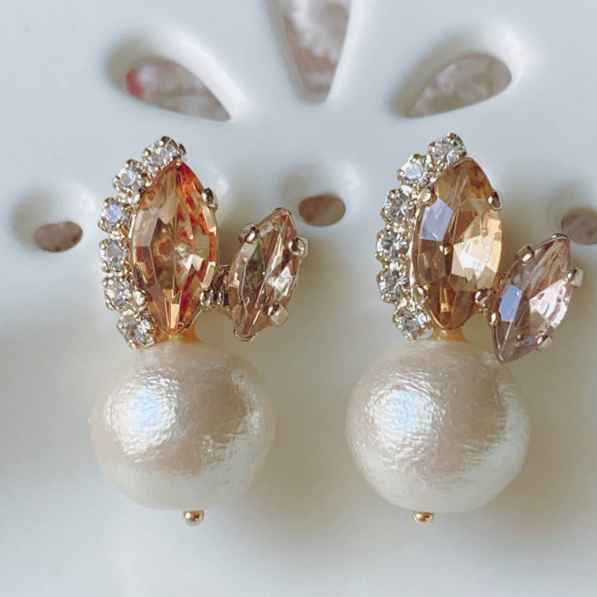 ピアス コットンパール ビジュー ラインストーン キラキラ オレンジ 高見え 未使用☆vintage jewelry accessoriesR0922