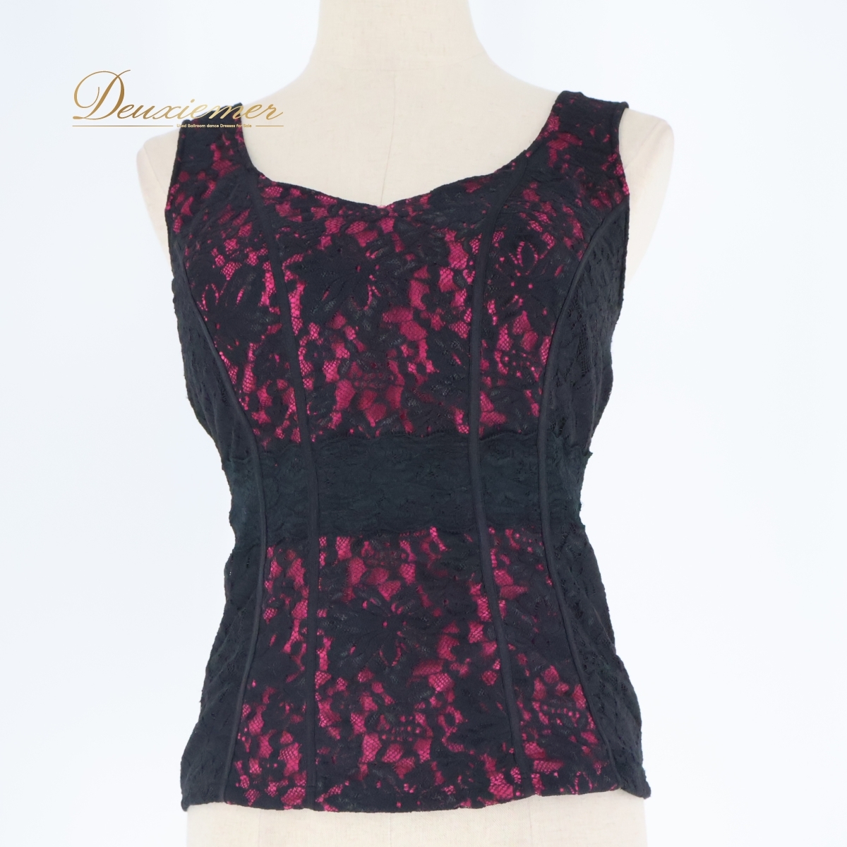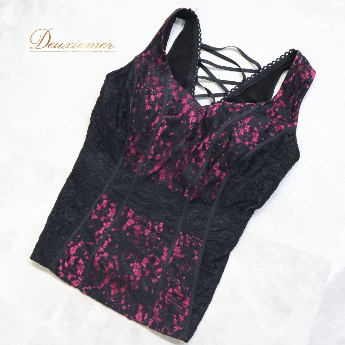 | 【商品名】社交ダンス 衣装 トップス 【サイズ】M表記 平置き実測:総丈約52cm(裾~肩部まで)、身幅約35cm、ウエスト約31cm~ ※実測の為、多少の誤差はご了承ください 【仕様】 ・伸縮性有り ・胸パッド有り ------------------------------------ 【ポイント】 ▽Chacott チャコット ▽黒×濃いピンクのお洒落なデザイン ▽総レースに編み上げがかわいい ------------------------------------ 【撮影時使用トルソー】 種 類:女性用トルソー7号(少し細めのサイズです) サイズ:肩幅約37cm、バスト約83cm、ウエスト約60cm、ヒップ約81cm |