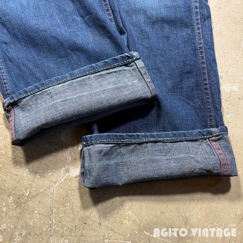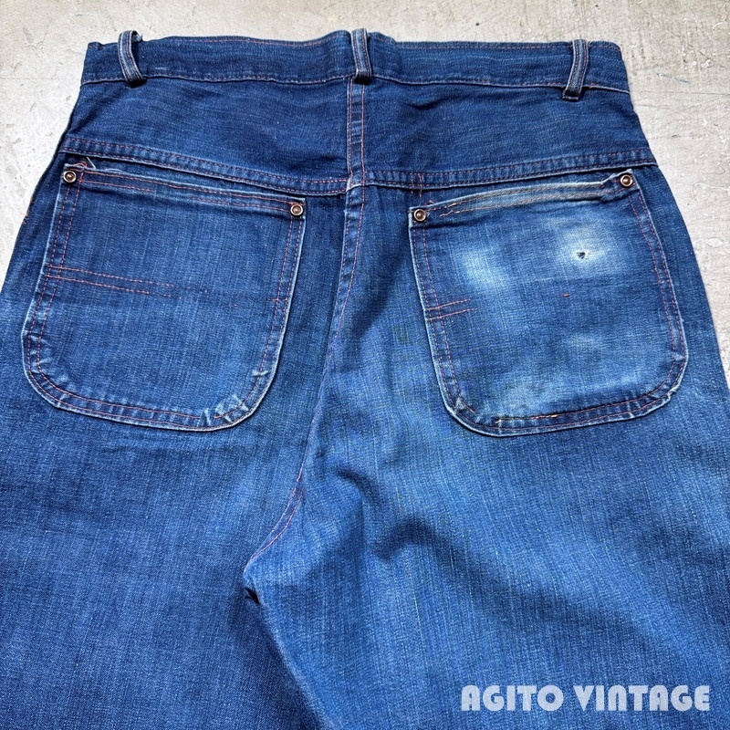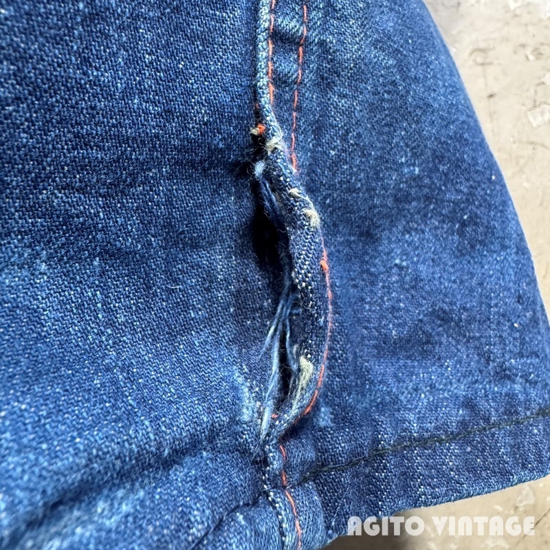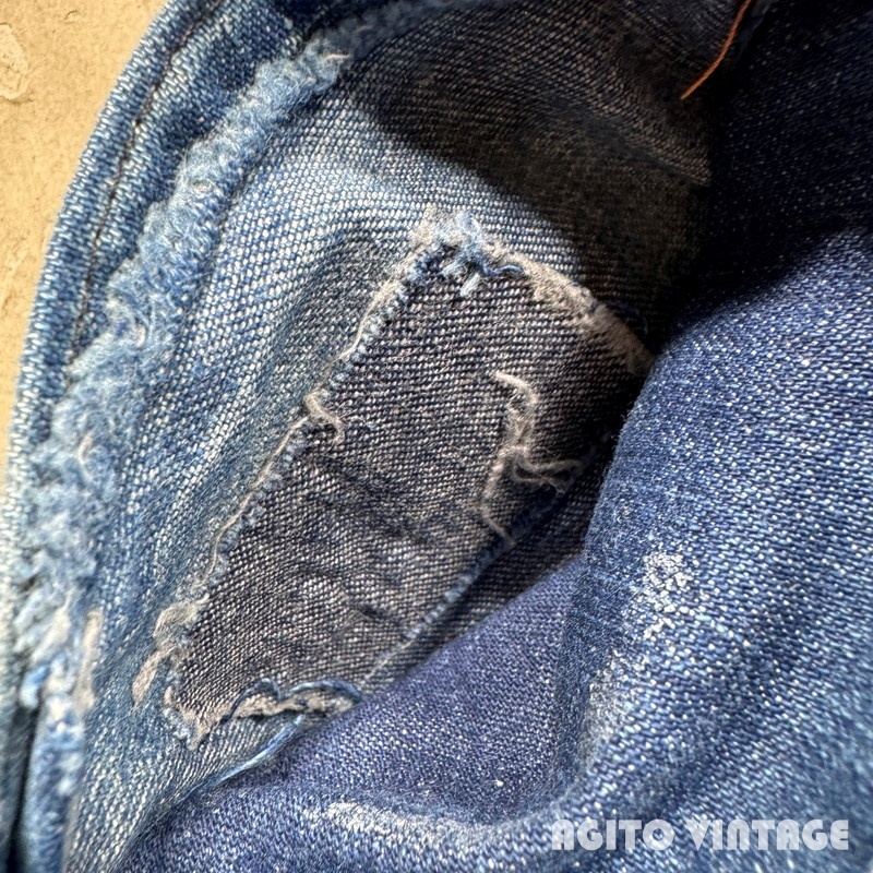 | STAFF COMMENT | 40年代から50年代初頭頃と思われるRUGGEDデニムペインターパンツです。ブランドの詳細は不明ですが、コの字のRAPIDピンロックジッパー、むき出しUFOリベット、ダブルステッチなど随所に古いディティールを備えた個体です。ポケットはベイカーパンツの様にL字に縫われています。ポケットのスレーキ部分には耳付きのデニムが使用されています。左腿付け根や右のバックポケットに簡易的なリペアが見られます。両裾には擦れによるダメージがございます。左裾インシームのステッチが飛んでいます。ウエストは実寸でW29.5です。色味も比較的残っていますのでこれからの経年変化も楽しめるのではないでしょうか。サイズの合う方は是非この機会にいかがでしょうか。 |