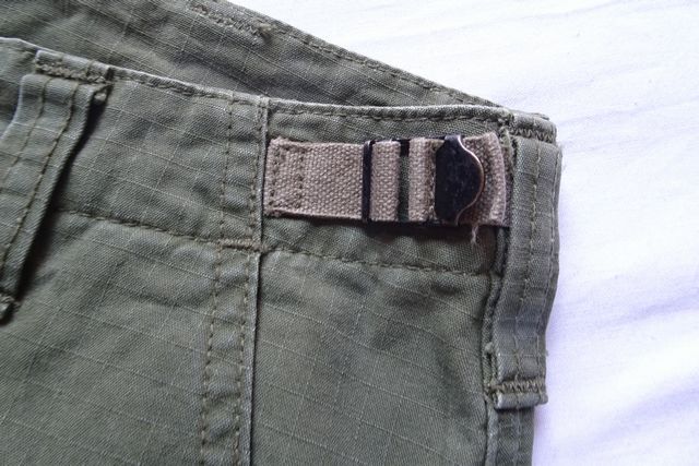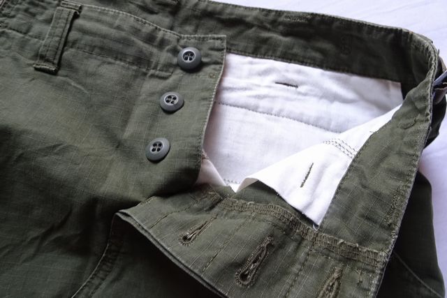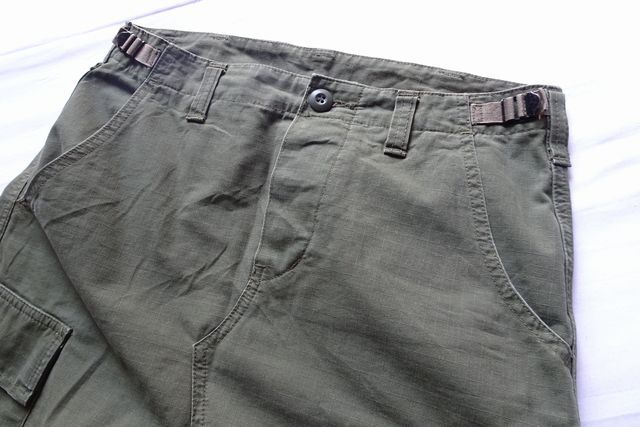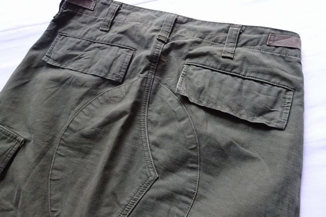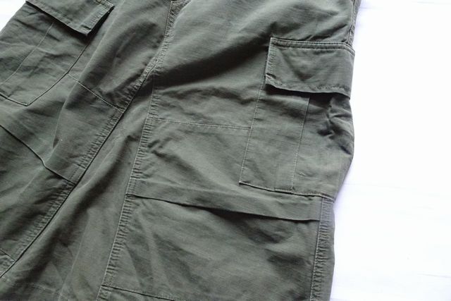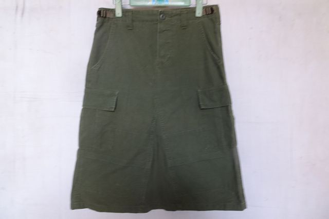 BEAMS BOY/ビームスボーイ/台形ひざ丈スカート/ミリタリーパンツリメイク風/前ボタンフライ/フラップポケット/緑系カーキ/サイズ0(7/30R7)