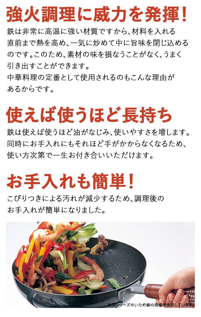 ◇金属表面に無数の凹凸を浮き立たせた特殊加工金属です。 ◇普通に調理するだけで、鉄に含まれる鉄分が食材に吸収され、自然に鉄分を補給できます。 ◇こびりつきにくい特徴から、油も少なくてすみ、油っぽくない健康的な調理を実現。 ◇鉄は使えば使うほど油がなじみ、使いやすさを増します。同時にお手入れにもそれほど手がかからなくなるため、使い方次第で一生お付き合いいただけます。 ◇こびりつきによる汚れが減少するため、調理後のお手入れが簡単になりました。 |