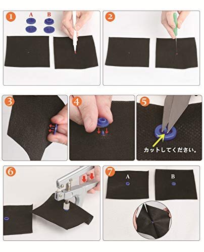 ポリアセタール取付け方法はカンタン!付けたい位置にスナップをセットして専用ハンディプレスで押し込むだけです。針や糸がなくても簡単に取り付け可能で、製品のようにきれいな仕上がりです。