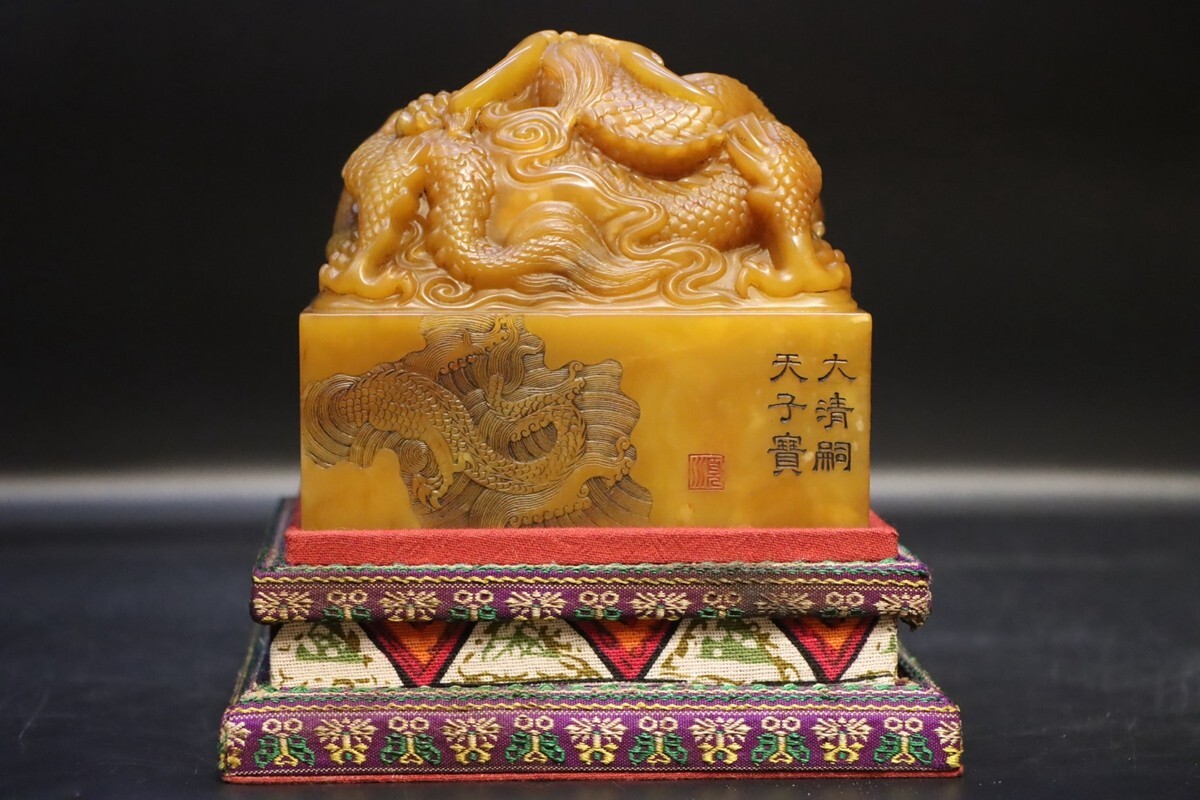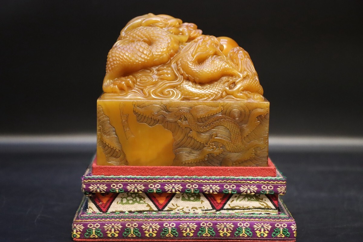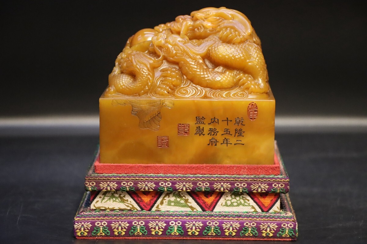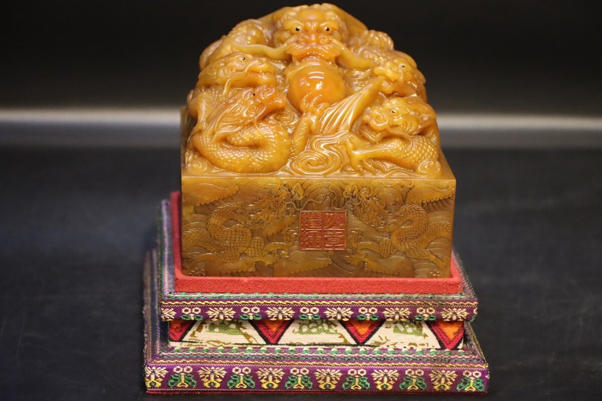 「清 乾隆二十五年内務府監製 老寿山石 田黄石彫り 五龍鈕璽印」極細工 擺件 古賞物 中国古美術 旧蔵出