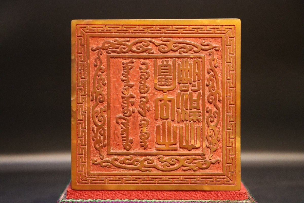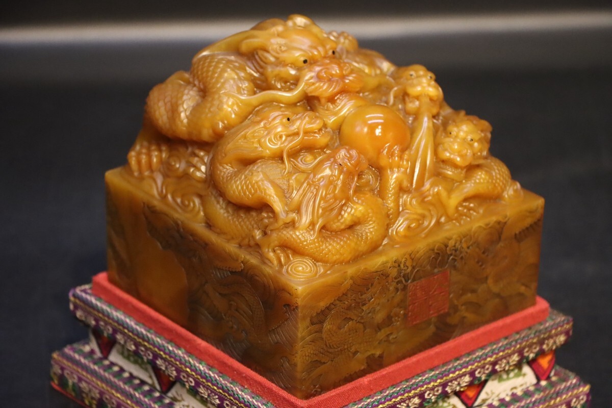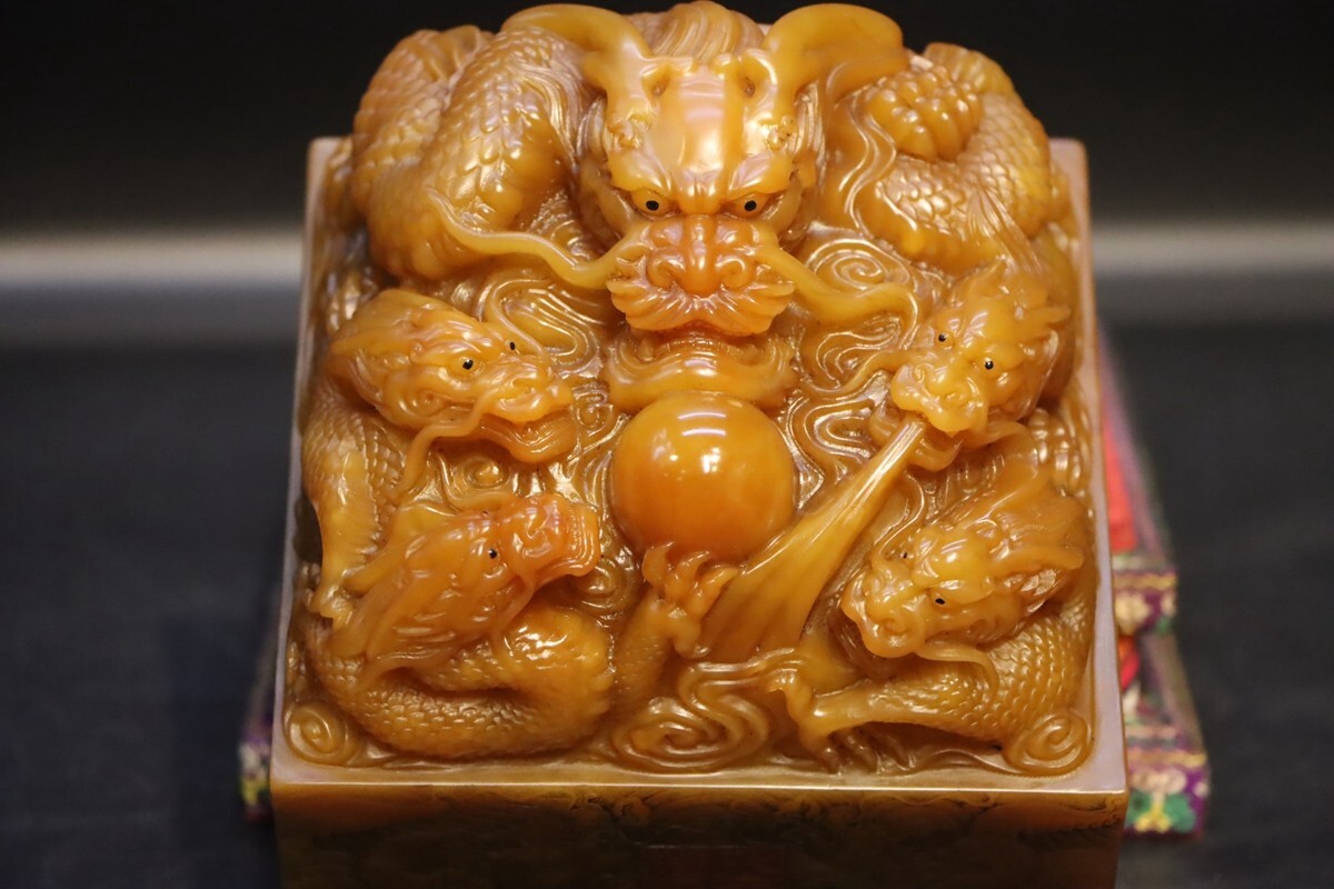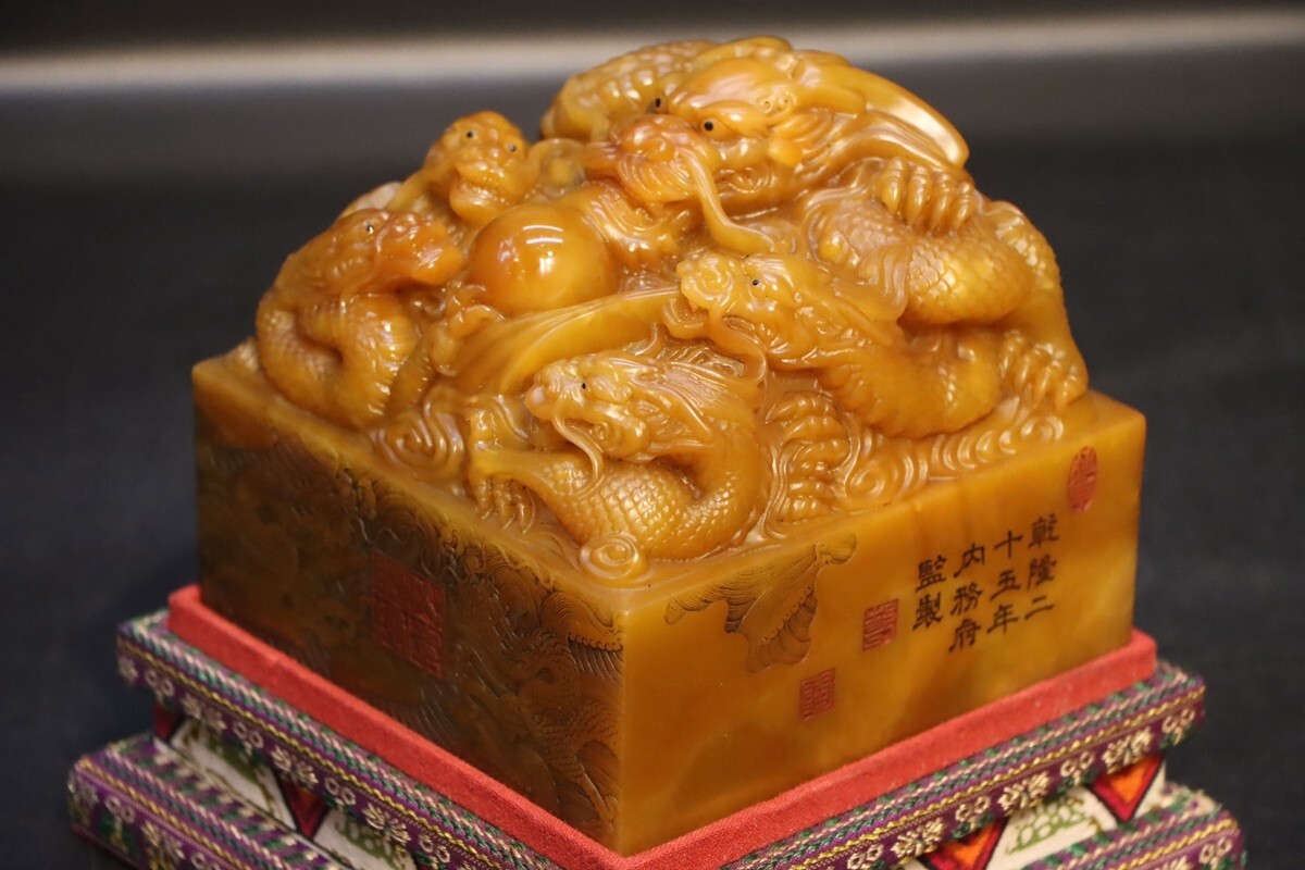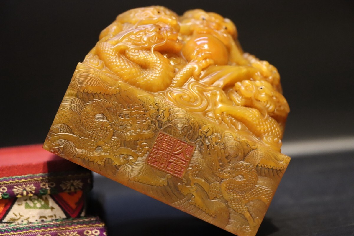 「清 乾隆二十五年内務府監製 老寿山石 田黄石彫り 五龍鈕璽印」極細工 擺件 古賞物 中国古美術 旧蔵出