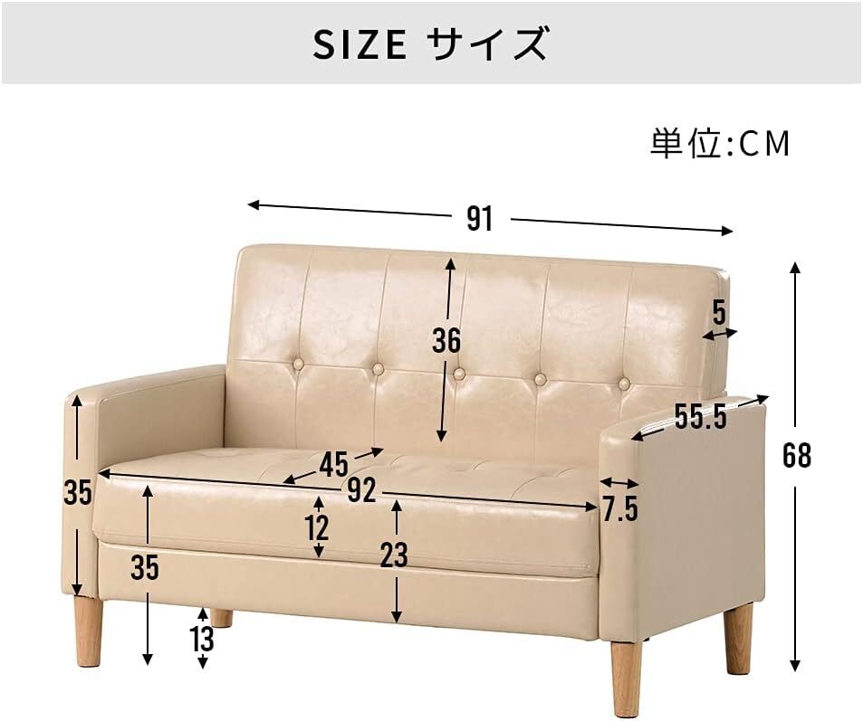 • ★【場所をとらないコンパクトソファ】:座面幅約105cmの、2人掛けソファ。 お部屋の広さが許されれば、出来るだけ大きいサイズのソファを置くことが出来ますが、限られたスペースの中でコンパクトに場所を取らず、またお部屋の圧迫感を軽減し空間を広く感じさせられる、そんなお望みには2.5人掛けのソファがおすすめです。