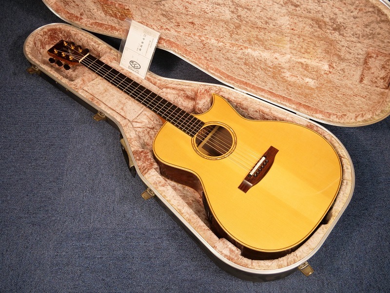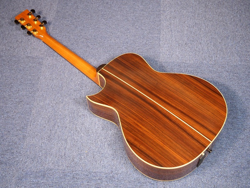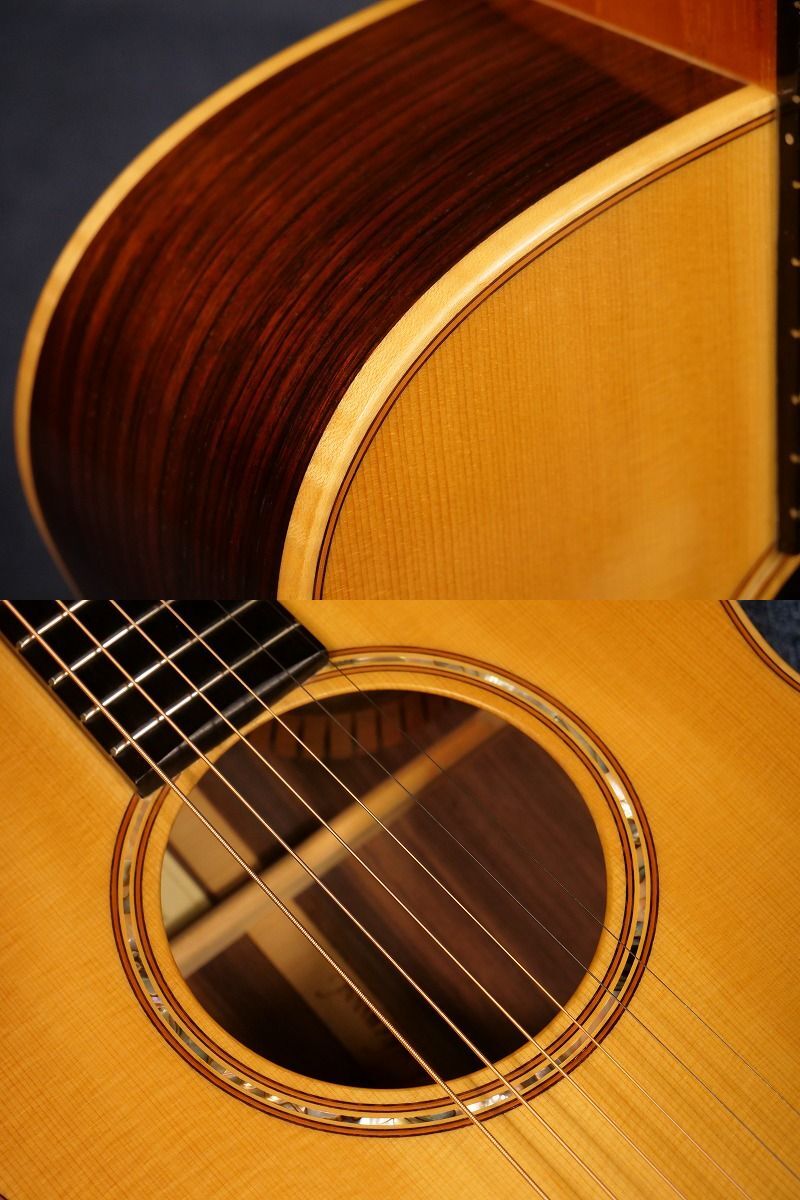 スペックはジャーマン・スプルース(またはイングルマンスプルース)/トップ、インディアンローズウッド/サイド・バックのALL単板、マホガニー/ネック、エボニー指板、ローズウッド駒、ロゼッタ/アバロンインレイ、バインディング/メイプル、ナット幅約44mm、650mmスケール