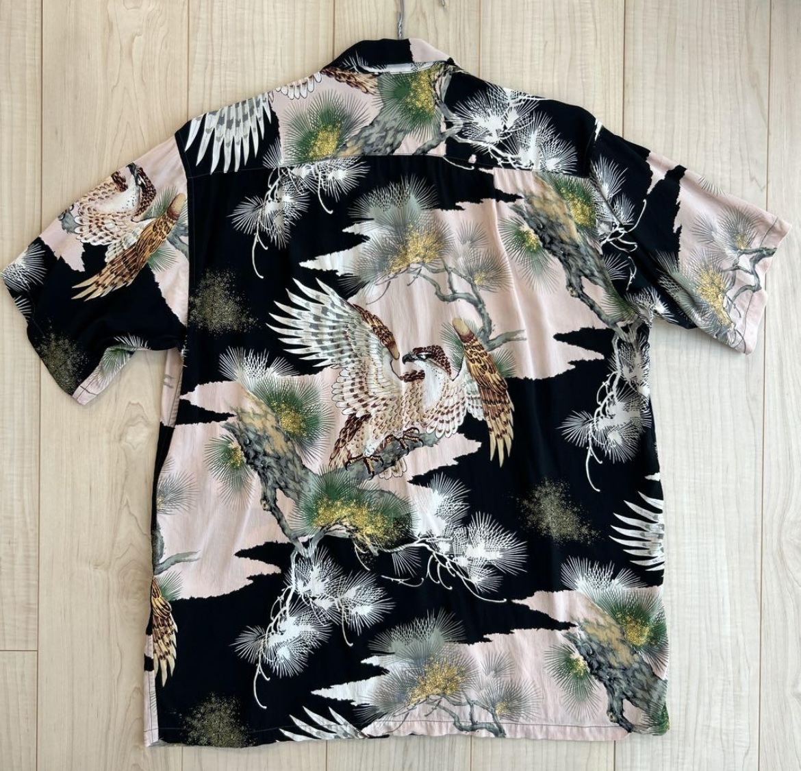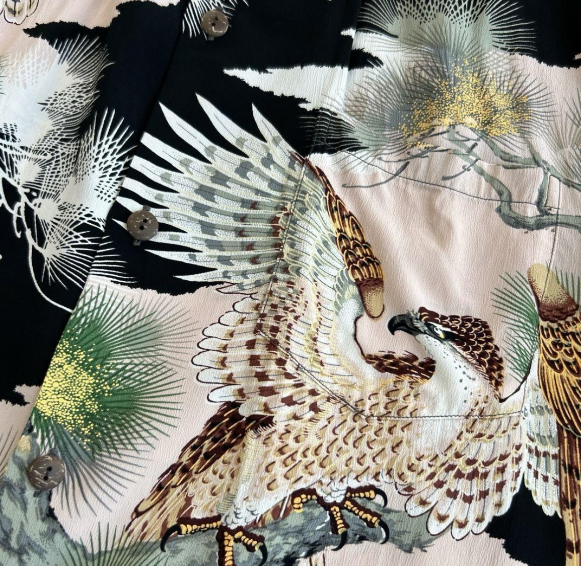 洋書「THE HAWAIAN SHIRT」(トミー・スティール著)の79ページに大きく掲載されている「キロハナ」ブランドの作品。過去に数多くのメーカーがレプリカを作っているが、オリジナルを基に忠実に再現されるのは今回が初めて。大きな鷹が斜めに連なる柄だしは、現在では再現の難しい22インチのリピートで絶妙な迫力と味わいを描き出している。今回復刻するレーヨン壁縮緬素材の他に、「ロス・サザーランド」ブランドでは富士絹で製品化されている。また「トロピカーナ」ブランドでは同じ柄をレーヨンの抜染で発表していることから、当時非常に人気の高かったデザインであるという事を伺い知る事ができる。トーミー・スティールの本ではこの作品が1940年代となっているが、「キロハナ」ブランドが1952年スタートという事から1950年代初期の作品と思われる。