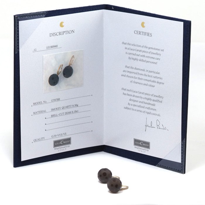 | LUCA CARATI ルカ・カラーティ 750 K18ゴールド スモーキークォーツ ダイヤ0.19ct フックピアス 証明書付 大粒 です。 ルカ・カラーティ(LUCA CARATI)は、イタリアのヴァレンツァで1988年に設立されたジュエリーブランド。スモーキークォーツにランダムなドットを施した遊び心溢れるデザインにダイヤが煌めく伝統とモダンが融合したピアスです。大粒でありながらシックなスモーキークォーツは耳元を上品に演出してくれます。 若干の小キズ程度の綺麗な商品です。皆様のご入札お待ちしております。 |