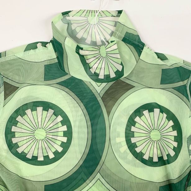 大胆でカラフルな総柄で、70年代にインスパイアされた美学を体現したトップスです。