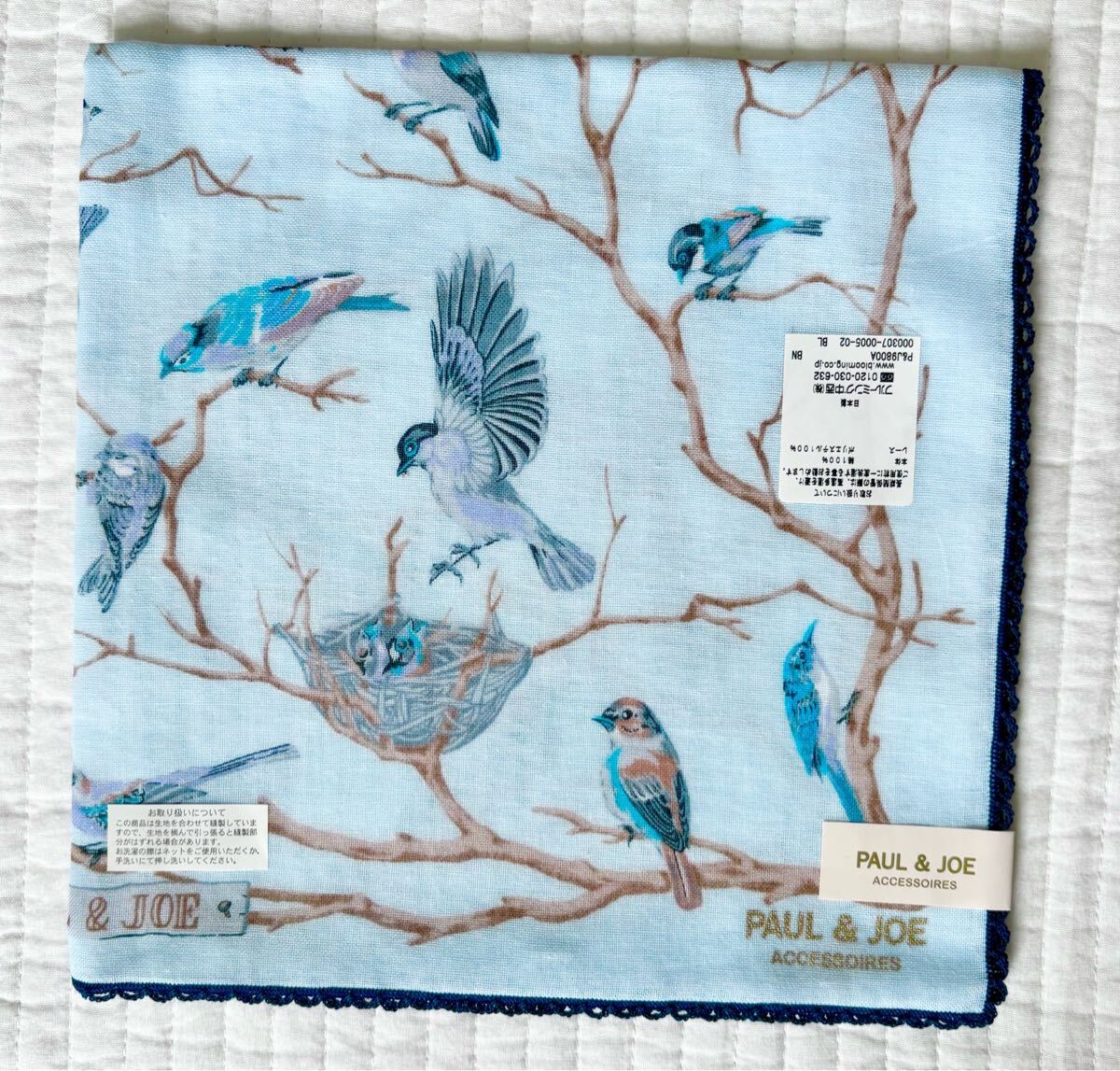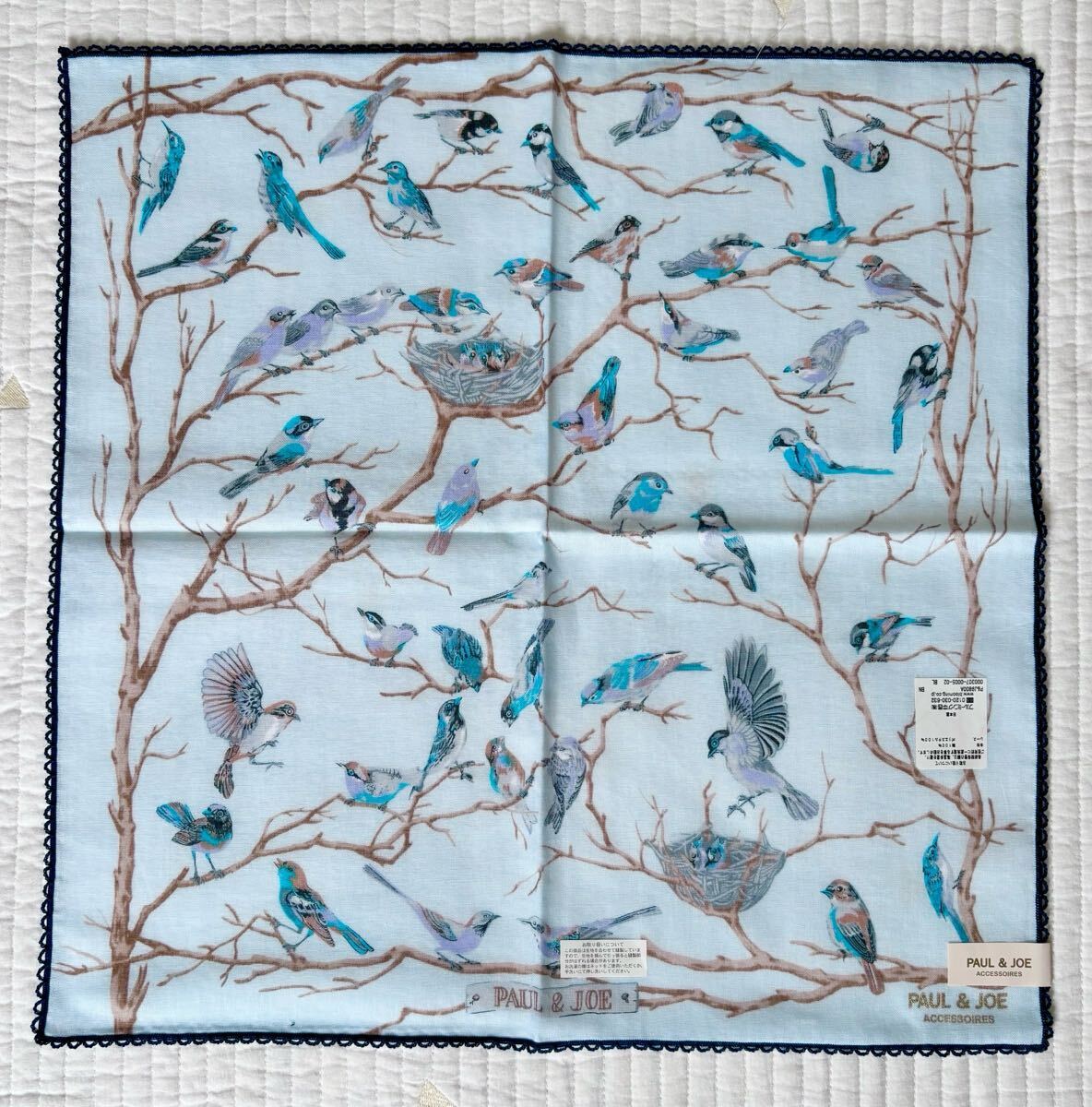 水色の生地に鳥のイラストが描かれたハンカチ。