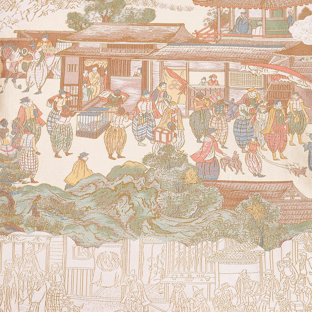 勝三照 本場筑前博多織 袋帯 本金箔 ベージュ・グレー・金箔暈し地 異人風景 (写真では上手く色が出ない場合があります。ご了承下さい) ※お使いのディスプレイの種類や設定の差により 実物の色と画像の色が少々異なることもございます。 |