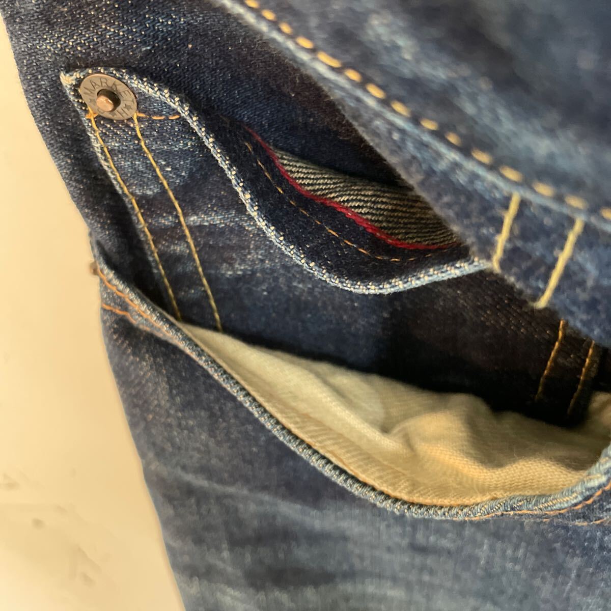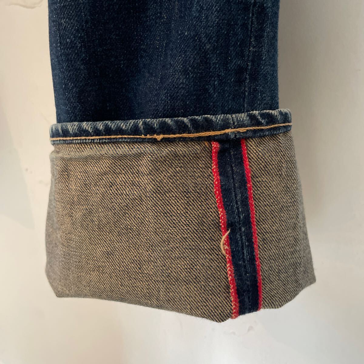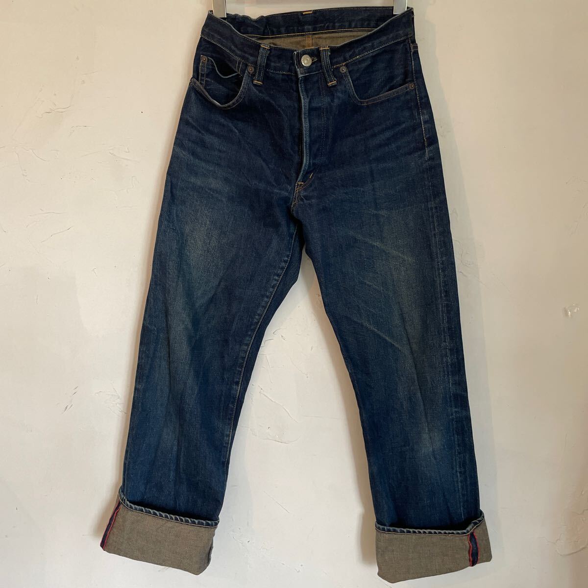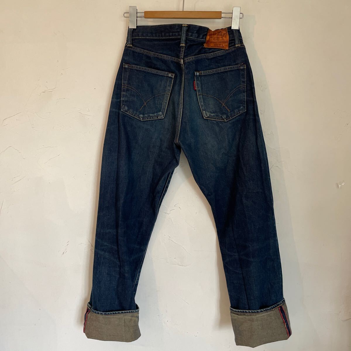 コットン100% インディゴブルー 雰囲気のあるデニムパンツになります。W30 革パッチ セルビッチ。サイズ感シルエットの良い品です。男女問わず履いて頂けるサイズ感です。日本製です。