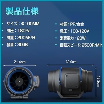 【新品送料無料】Okryain ダクトファン 低騒音 100mm ダクト用換気扇 中間取付形ダクトファン 大風量 業務用有圧換気扇 100-120V