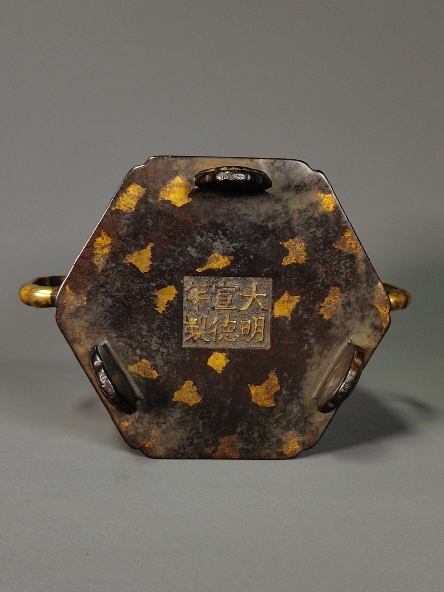 【瓏】古銅鏨刻彫 灑金団龍紋 双耳香炉 大明宣徳年製 銅器 古美術 骨董品 香道具 蔵出