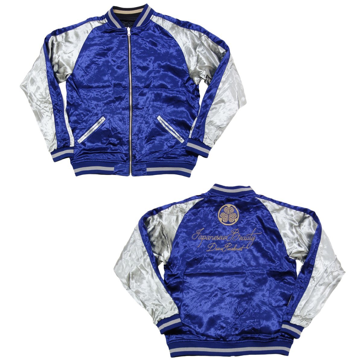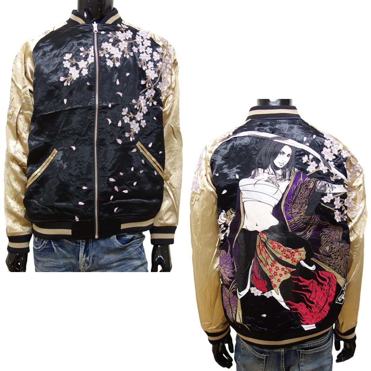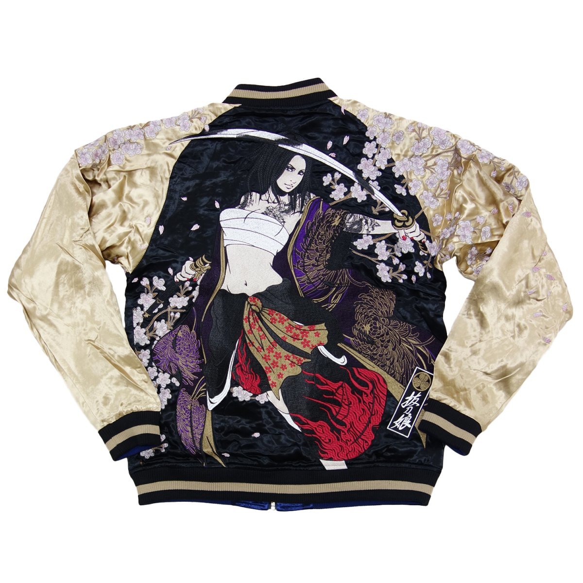 抜刀娘の前開きのスカジャンです。2021年、秋モデルのトップス、アウターの新作です。サクラを背景にした葵が巧みな刺繍でジャケットにあしらわれています。また着物は細部まで緻密に表現されており、抜刀娘の技術力の高さがうかがえます。ちらっと覗く竜(龍)の刺青(タトゥー)もセクシーです。刀と美女の姉御という絶妙なミスマッチ感も相変わらず健在の、着ているだけで十分に個性を主張できるジップアップの羽織りです。