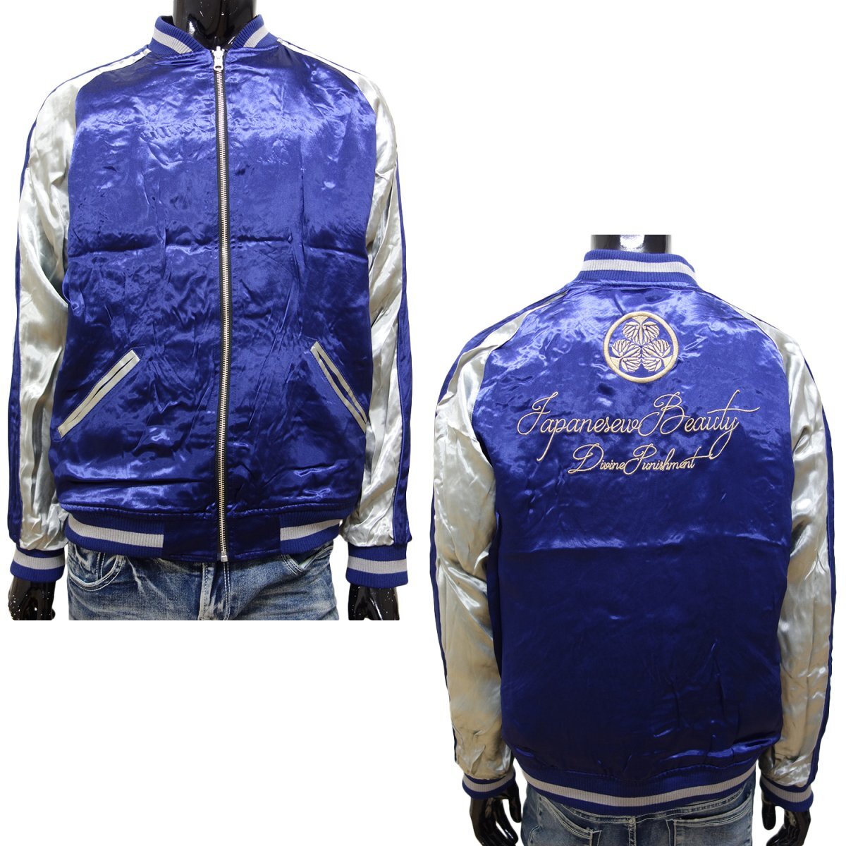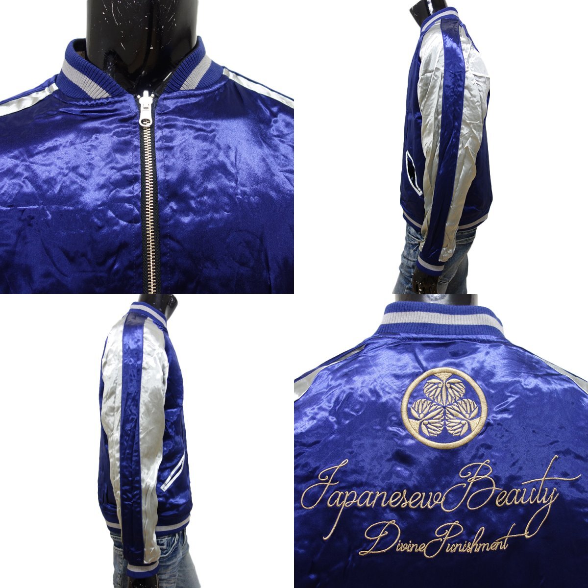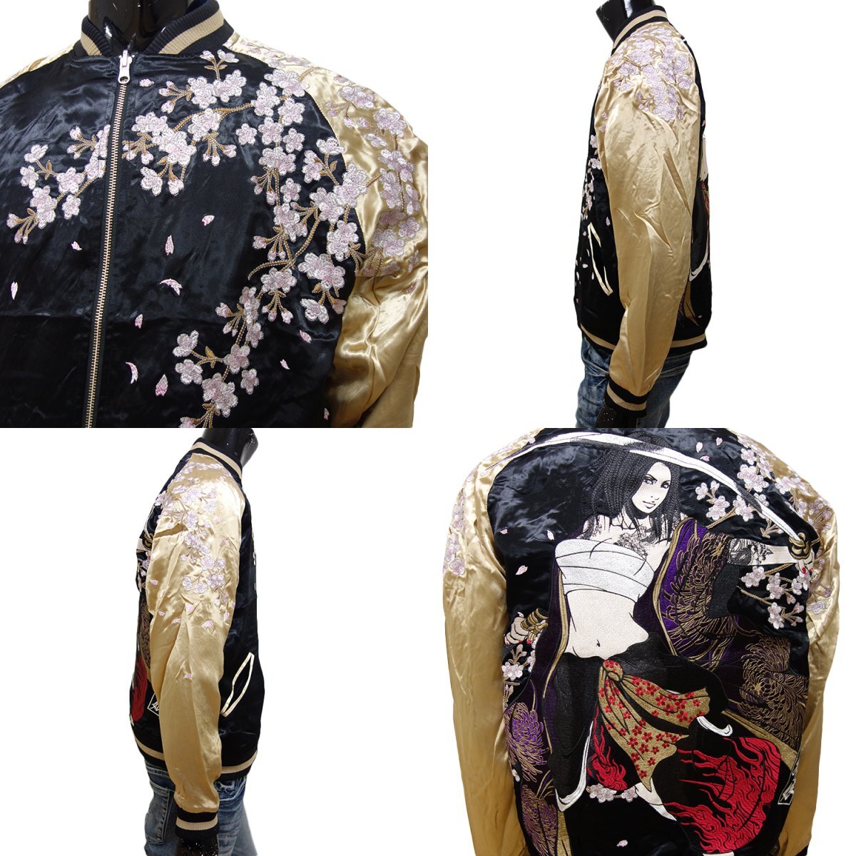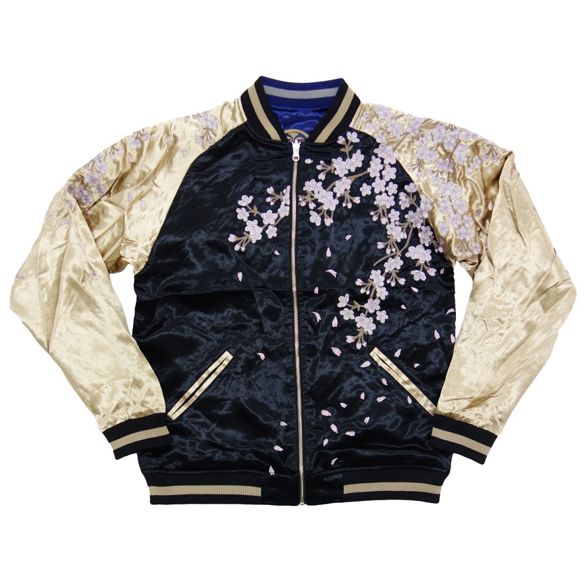 抜刀娘の前開きのスカジャンです。2021年、秋モデルのトップス、アウターの新作です。サクラを背景にした葵が巧みな刺繍でジャケットにあしらわれています。また着物は細部まで緻密に表現されており、抜刀娘の技術力の高さがうかがえます。ちらっと覗く竜(龍)の刺青(タトゥー)もセクシーです。刀と美女の姉御という絶妙なミスマッチ感も相変わらず健在の、着ているだけで十分に個性を主張できるジップアップの羽織りです。