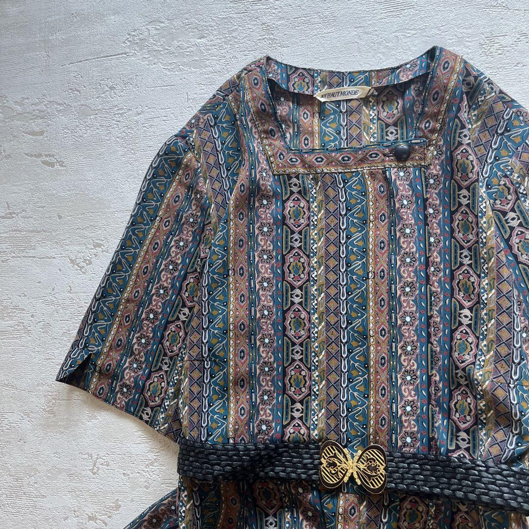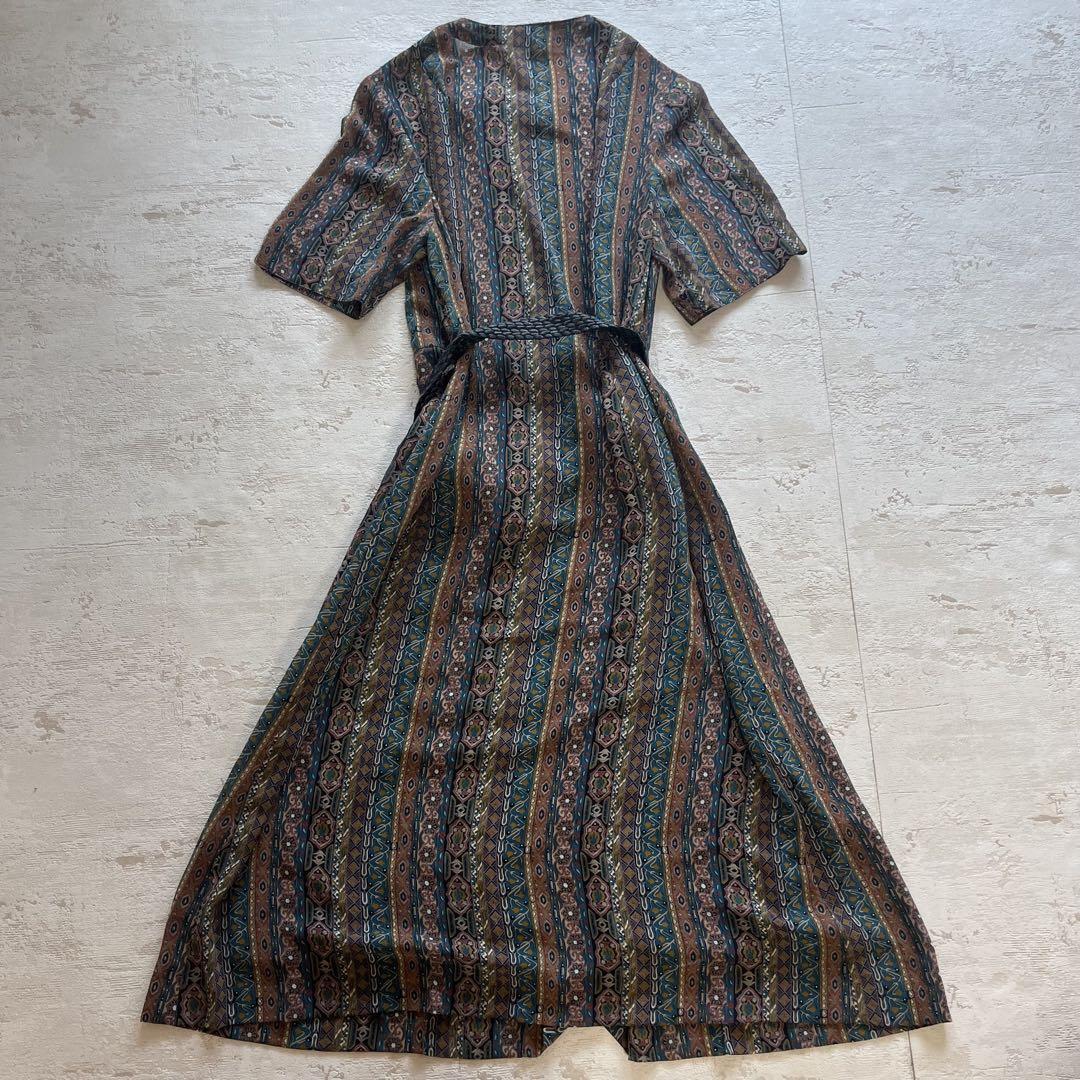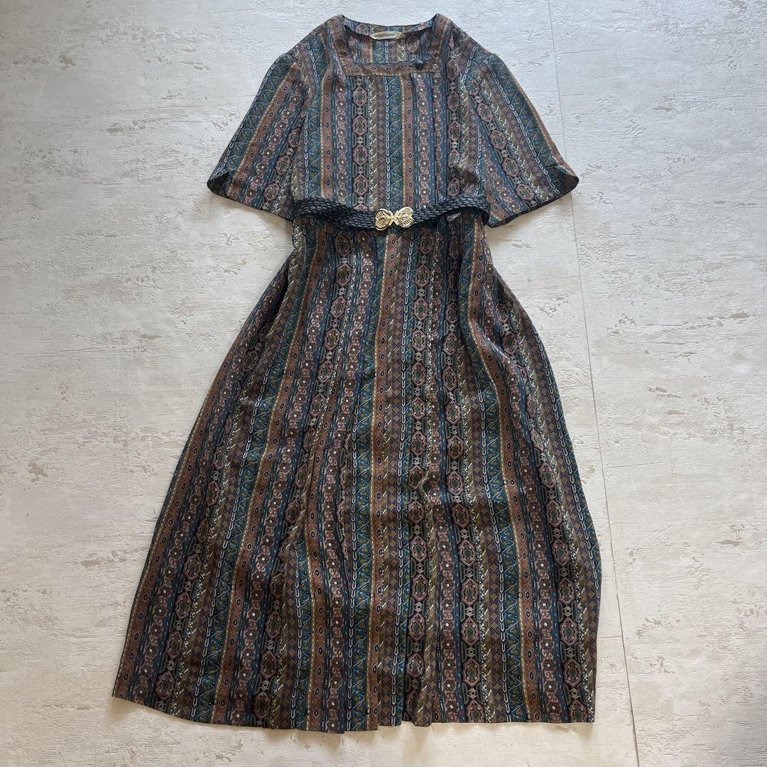 昭和レトロ【レトロ可愛い】幾何学×花柄のヴィンテージ風ワンピースベルト付きL1