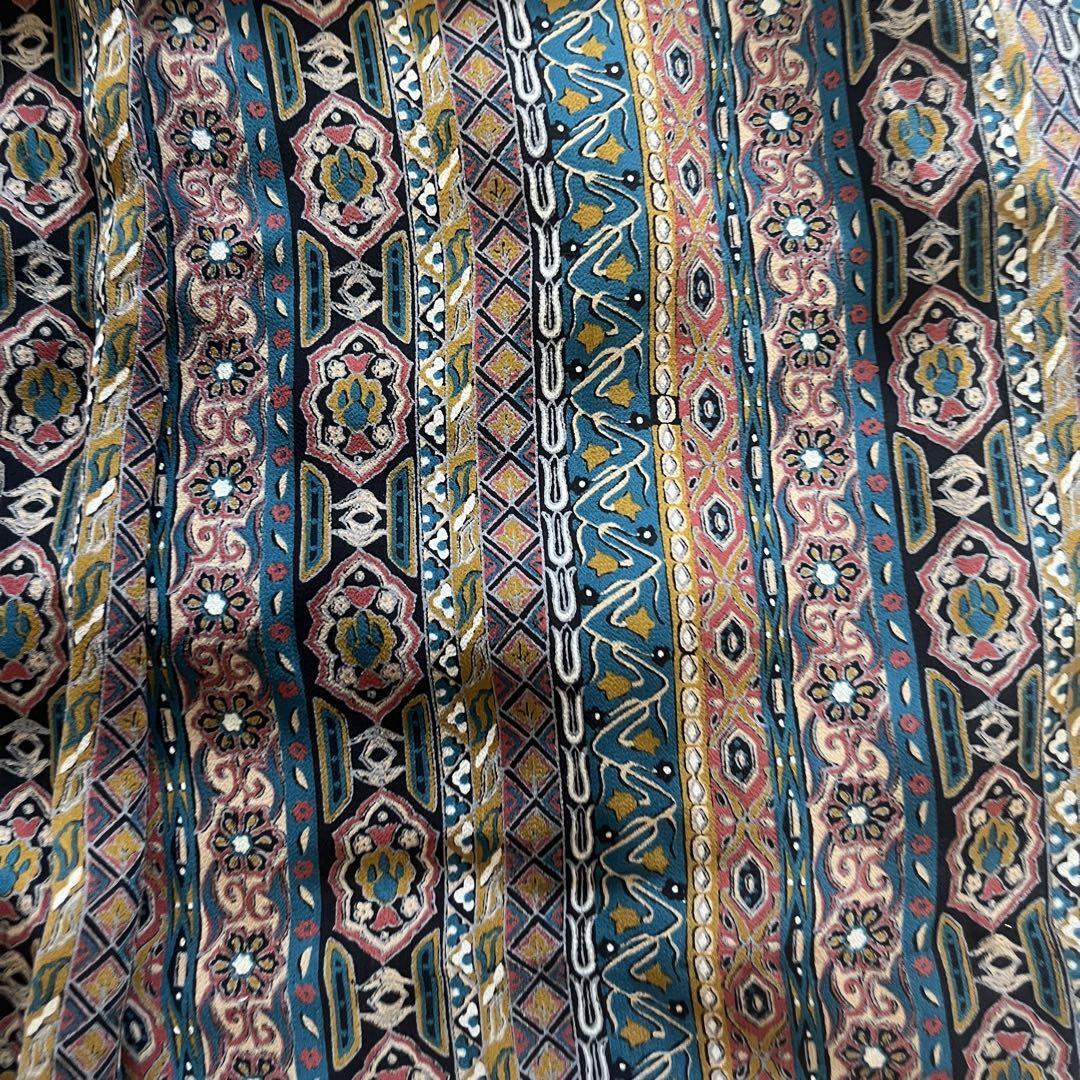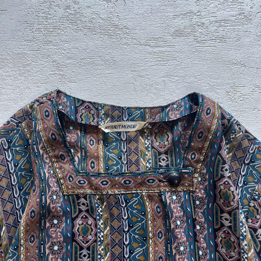 レトロな雰囲気が魅力の幾何学×花柄プリントのワンピースです。深みのあるカラーリングと民族調デザインが、1枚でおしゃれに決まるアイテム。ゆったりしたシルエットにウエストベルト付きで、スタイル良く見えるのも嬉しいポイント。柔らかな生地感で動きやすく、秋冬はタートルとの重ね着もおすすめ◎古着やエスニックコーデが好きな方にもぴったりな一着です。
