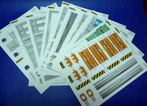 カラー印刷されたプリント部品を切りぬき、組み立てます。同封されているスチレンボードは建物・本体の内側から強度補強するために接着します。