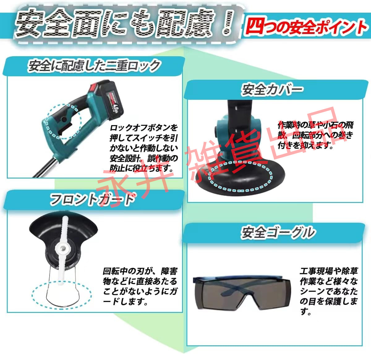 ◆騒音小・安全!エンジン音がしないので、早朝や休日でも思い立ったときに草刈りができます。安全カバーやフロントガード、安全スイッチと運転スイッチのダブルロック仕様など、安全面にも配慮されています。