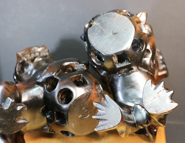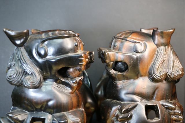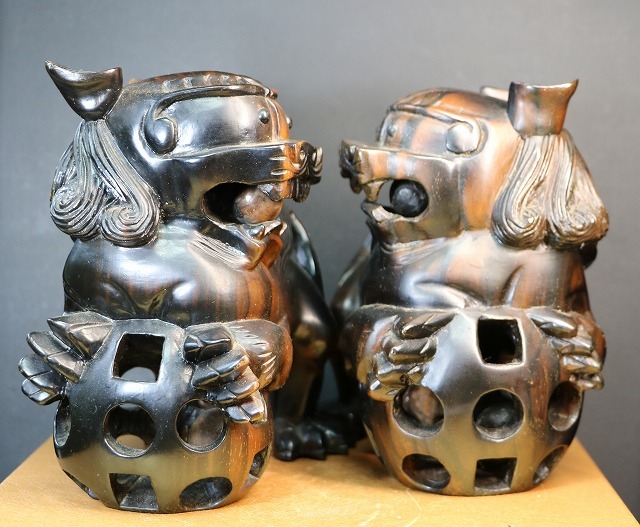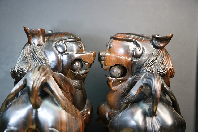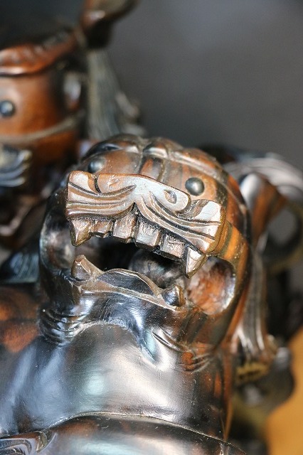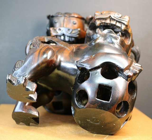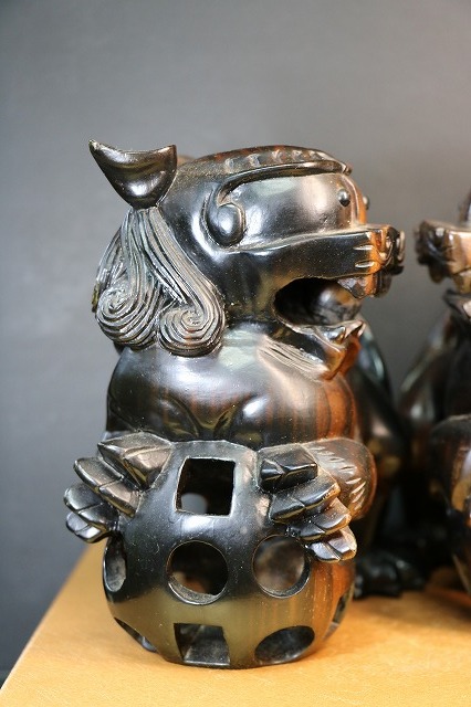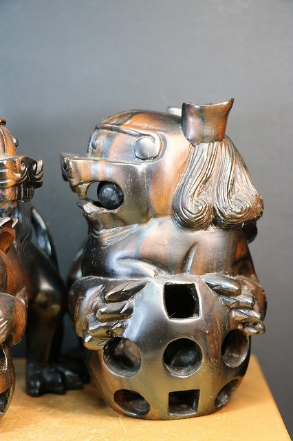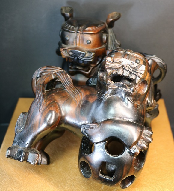 玉を咥えた優れた木彫り細工物の獅子二対です。