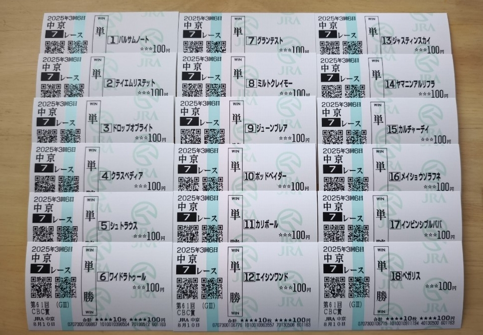 2025.8.10 CBC賞 出走全頭現地単勝馬券18枚です。