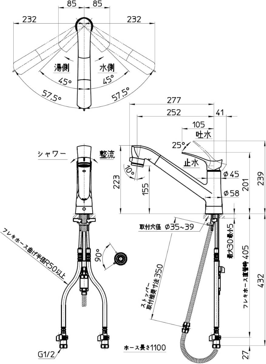 ・吐水パイプ回転規制115° 吐水パイプが後ろまで回らないので安心。