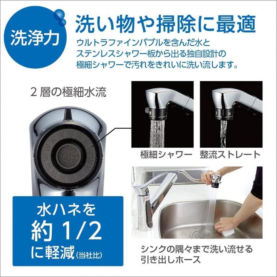 ・ホース引き出し1.1m ウルトラファインバブルを含んだステンレスシャワー板独自の水流で汚れをきれいに洗い流します。極細水流で水ハネを約1/2に軽減。