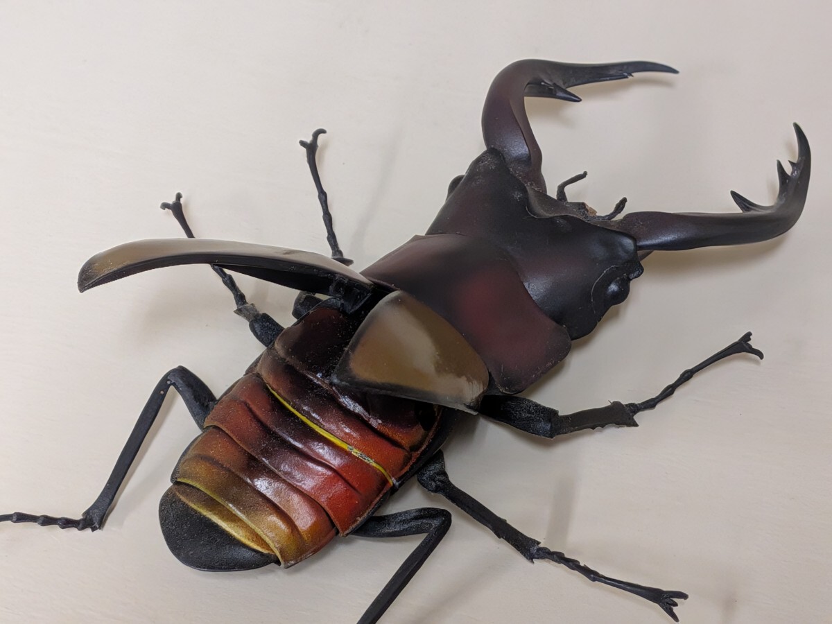 現物よりも大きめのリアルなノコギリクワガタです。羽根を広げると腹もリアルに作られています。
