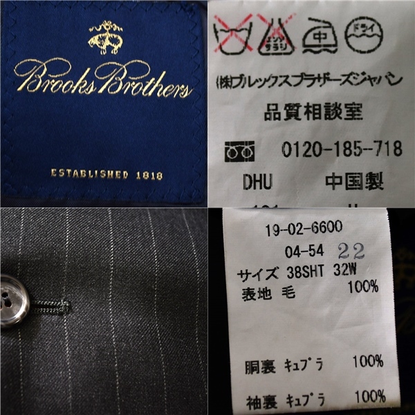 ・(株)ブルックスブラザーズジャパン。型番:19-02-6600-04-54。春秋冬対応。3つボタンシングル。フラップポケット。サイドベンツ。袖口4つボタン。開き見せ。総裏地仕上げ。ネーム刺繍あり。