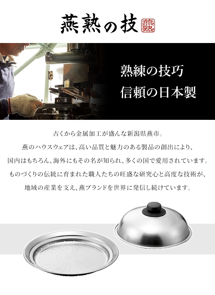 お手持ちのフライパンにのせるだけで手軽に本格的な蒸し料理が楽しめる蒸しプレート。 温野菜や蒸し芋やとうもろこしに◎ 古くから金属加工が盛んな燕三条で作られている信頼の製品です。 日常の調理をより快適にし、簡単に本格的な蒸し料理が楽しめます。 |