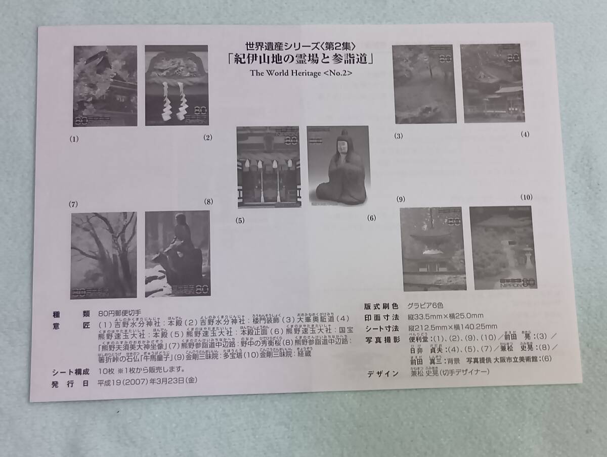 世界遺産シリーズ 第2集 紀伊山地の霊場と参詣道 H19 切手シート1枚と切手図鑑 Y